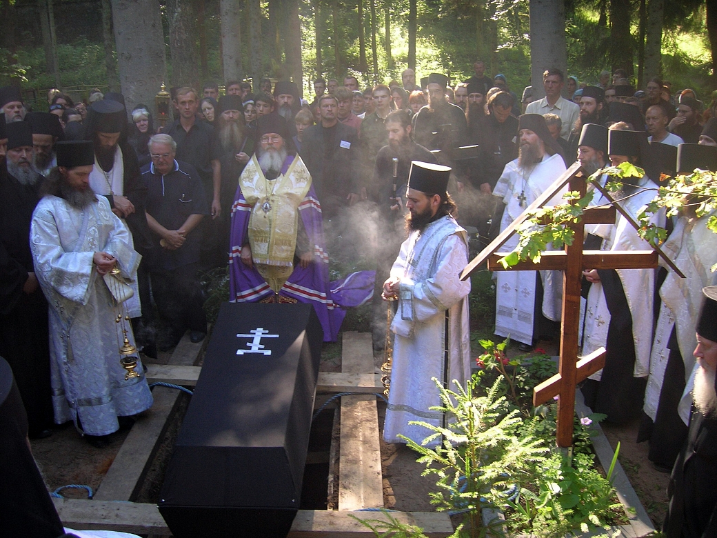 Хоронили 7 августа. Народу было — ни на одном крестном ходу столько не видел. Говорили прощальные слова над гробом отец Давид и владыка Панкратий. Запомнилось: «Почему, Господи?.. Мы знаем, что имеющие упование не должны скорбеть, — но всё равно скорбим и плачем». 7 августа 2007 года. Фото инока Алексия (Лютова)