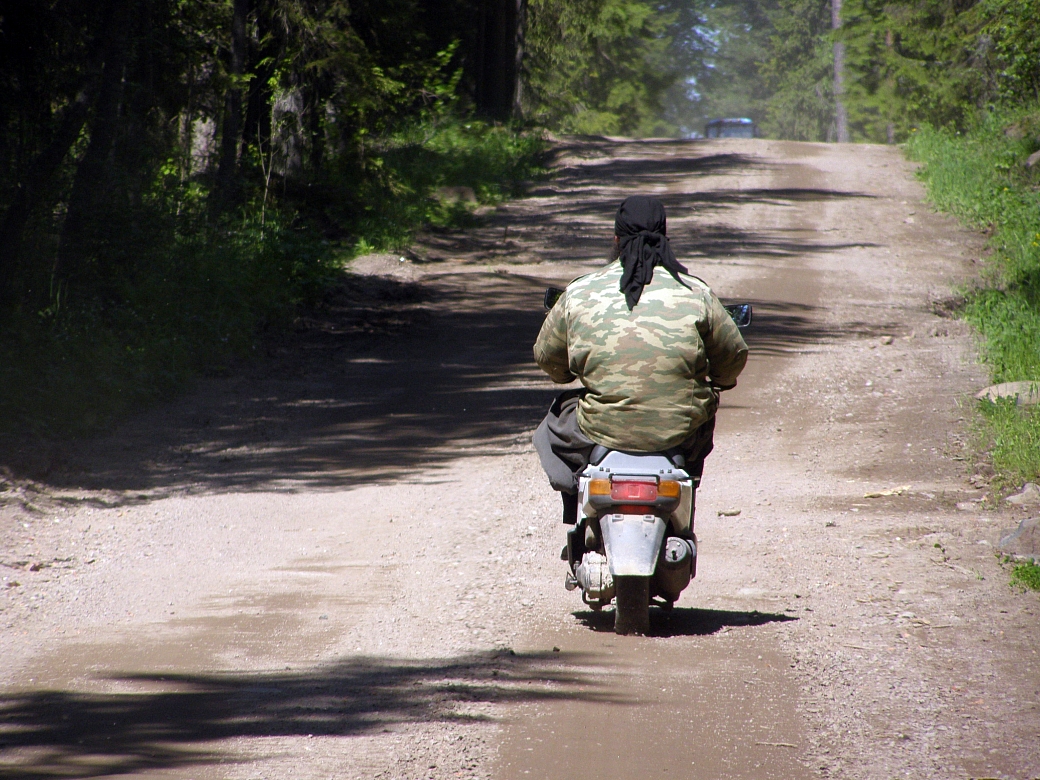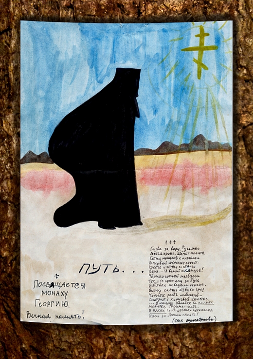 Потом пошёл на ферму. Место аварии по цветам узнал. На сосне рядом приколот листок с чьим-то рисунком и стихами, колышется от ветра и машин проходящих. Стихотворение «Путь» называется, на рисунке монашеский силуэт на фоне синего неба.