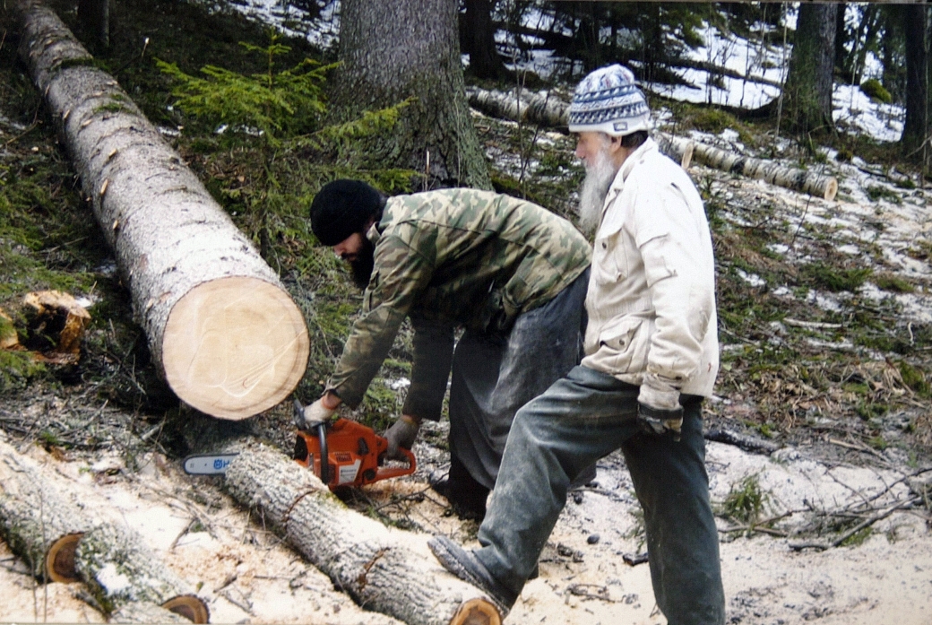 Вот так и с Георгием. Мы не разговаривали об альпинизме, нет, этого не нужно было. Сошлись на работе в лесу, на расчистках и заготовке дров. Он опытным пильщиком уже показал себя, успел поработать до монастыря где-то в парковом хозяйстве. Домой с уловом. Фото монаха Авраама. Январь 2015 года