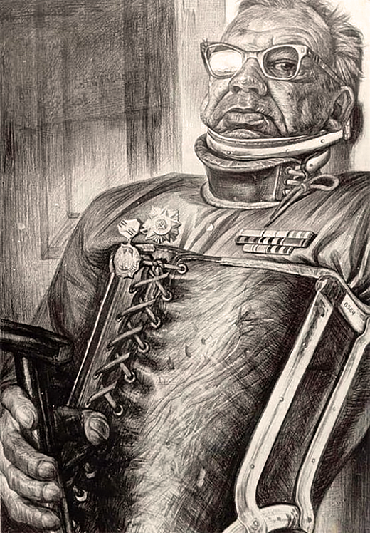 А за окном лето в разгаре, начало июня. Окна открыты, сирень цветёт, солнце пробивается. Я иду, иду, до конца почти дошёл. Вижу — сидит в кровати молодой мужчина, совсем-совсем молодой. Он опёрся на столик, который перед ним, подушки тут у него. А голова — я смотрю — пробита пулей навылет. И не то что маленькое какое-то отверстие, а как бы насквозь пробит череп, то есть зияли две дыры, затянутые кожей. И с этими двумя отверстиями на самом видном месте он жил.