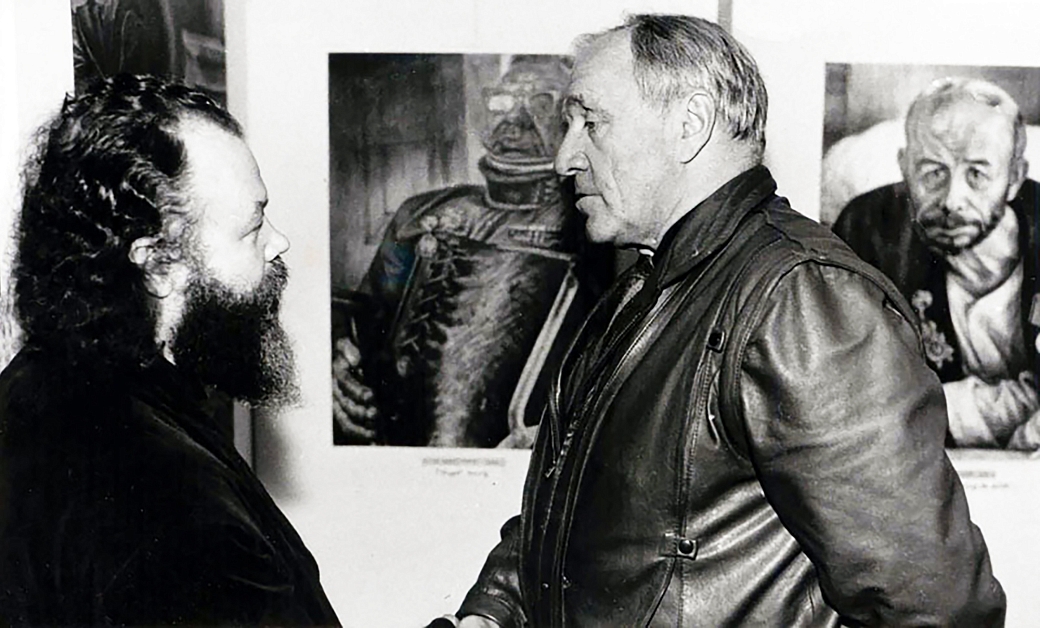 Художник Геннадий Добров и Михаил Ульянов на одной из первых выставок серии "Автографы войны" в Москве. Конец 80-х годов.