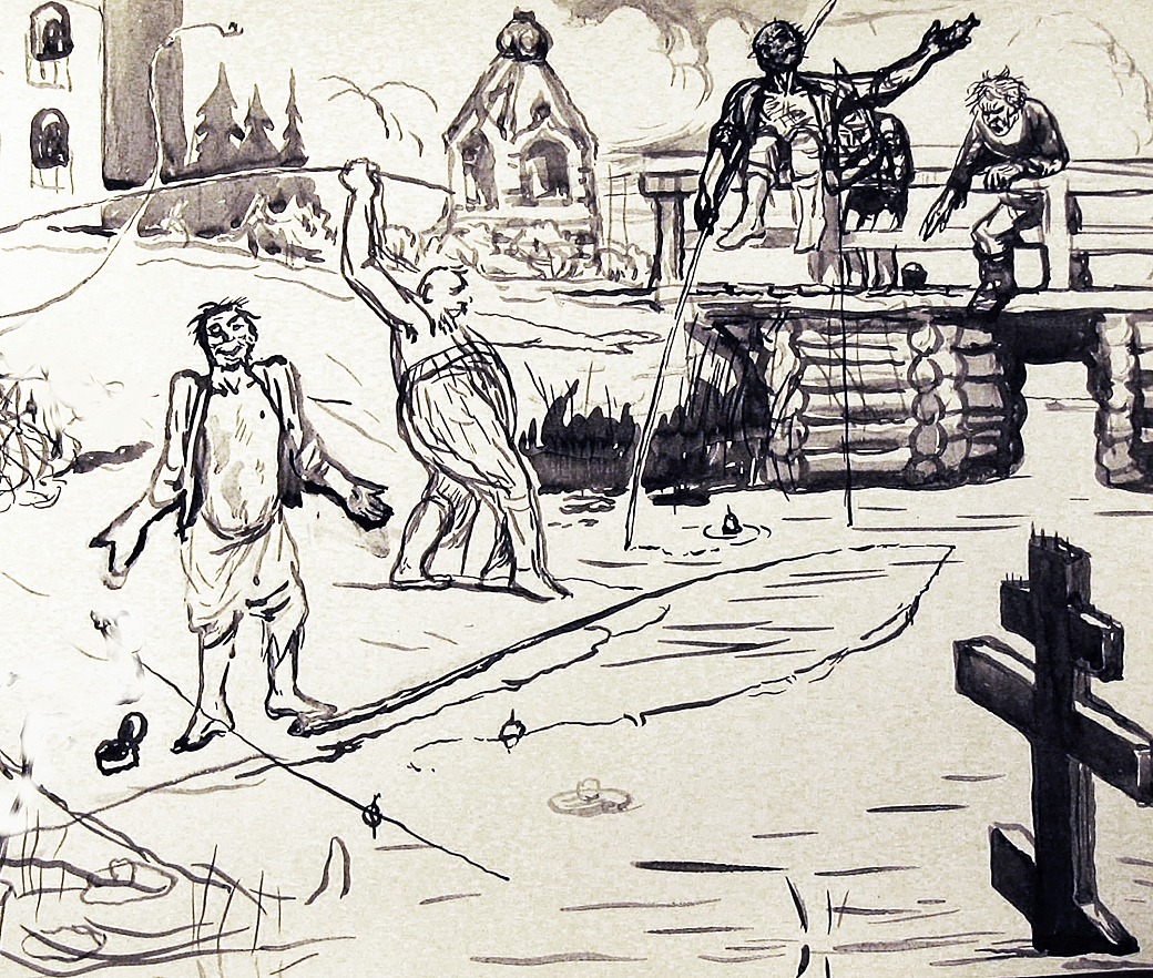 А другой больной зашёл в воду и пытался воткнуть в дно этой протоки крест ещё большего размера. Вода идёт, а над ней крест возвышается. Вот так они забавлялись. Церковь стояла тут же недалеко на другом маленьком островке, куда тоже вели мостки.