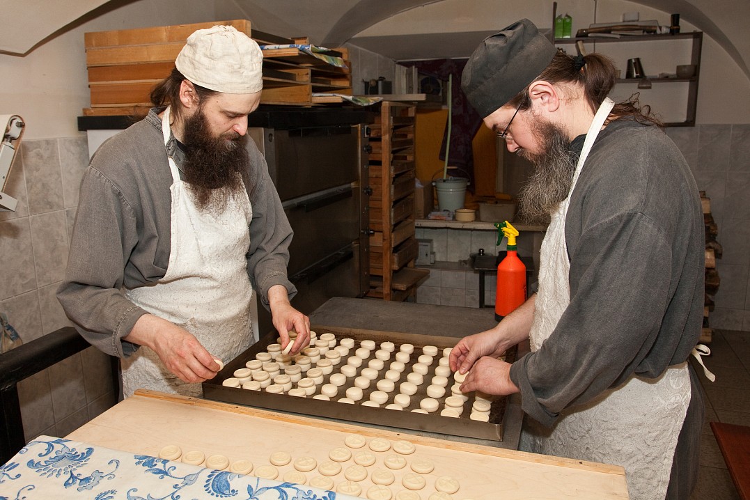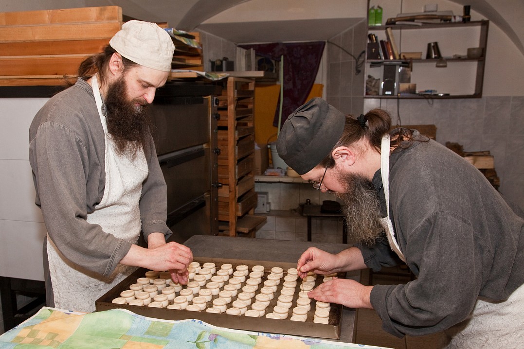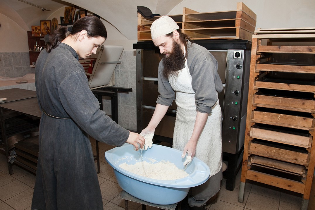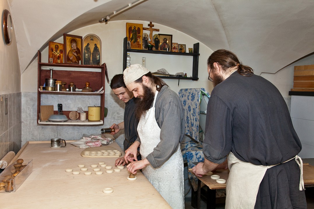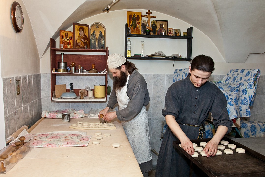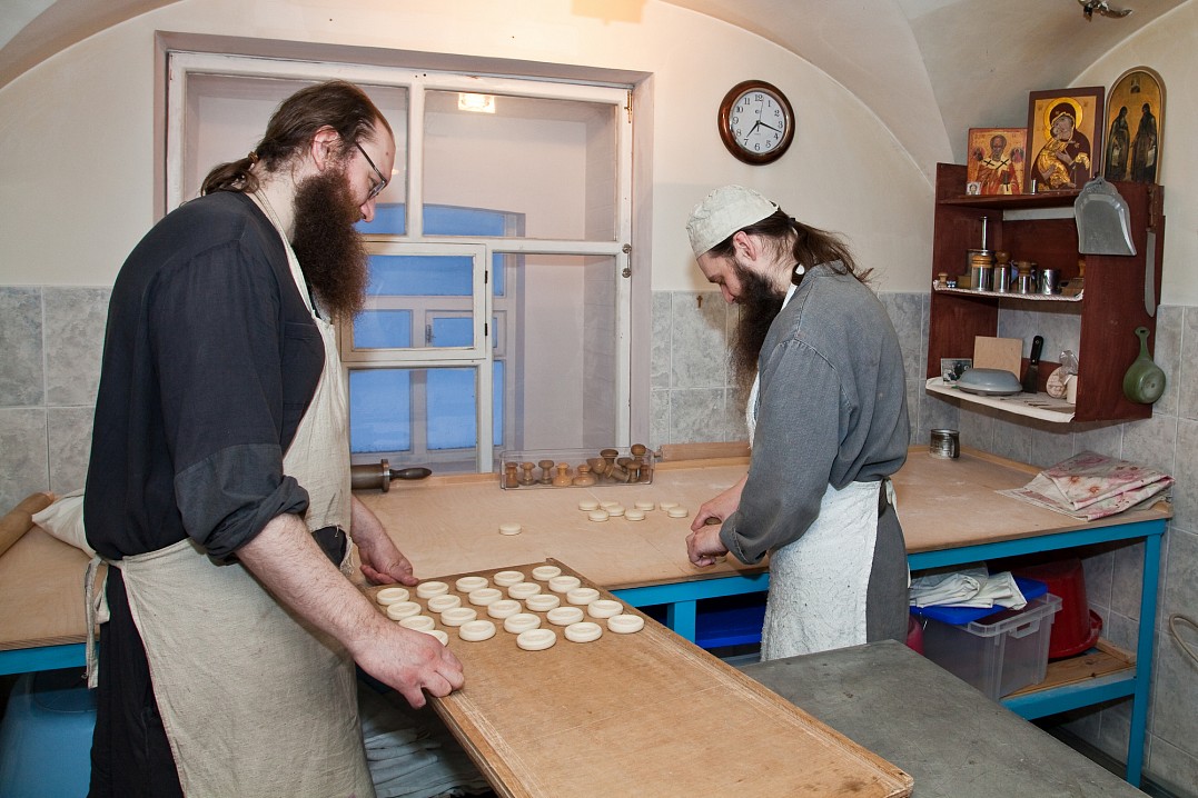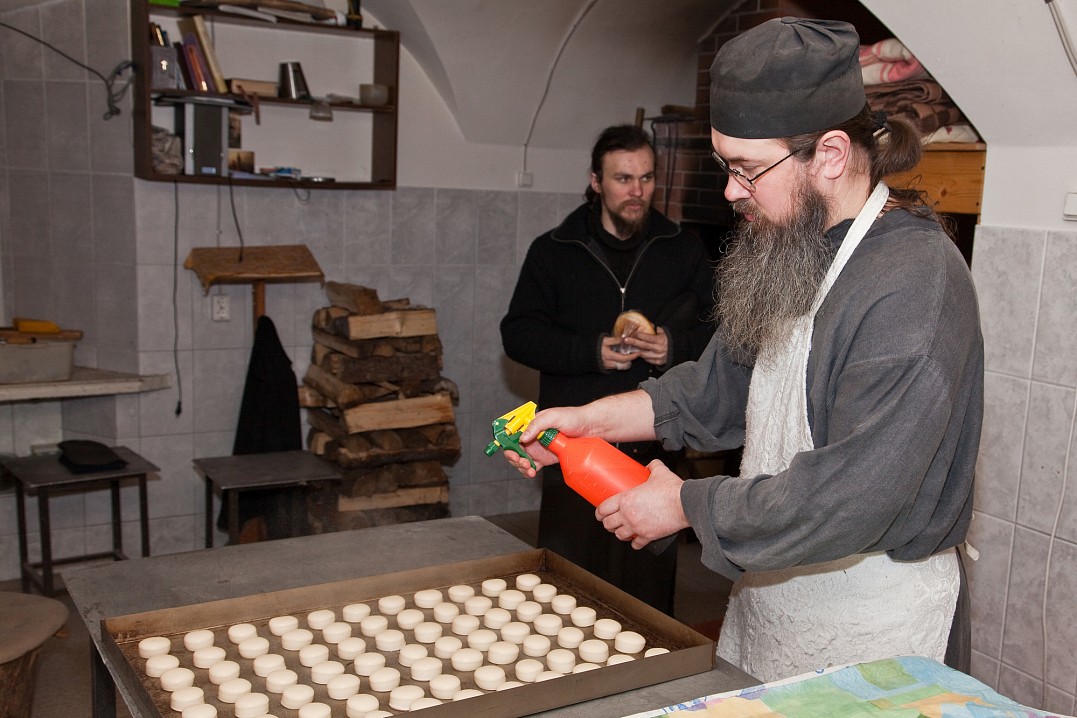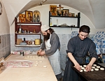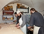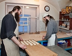 На послушании в Просфорне. На фото: иеродиакон Дамиан, послушник Никон (монах Никандр). Март 2009 года.