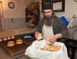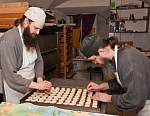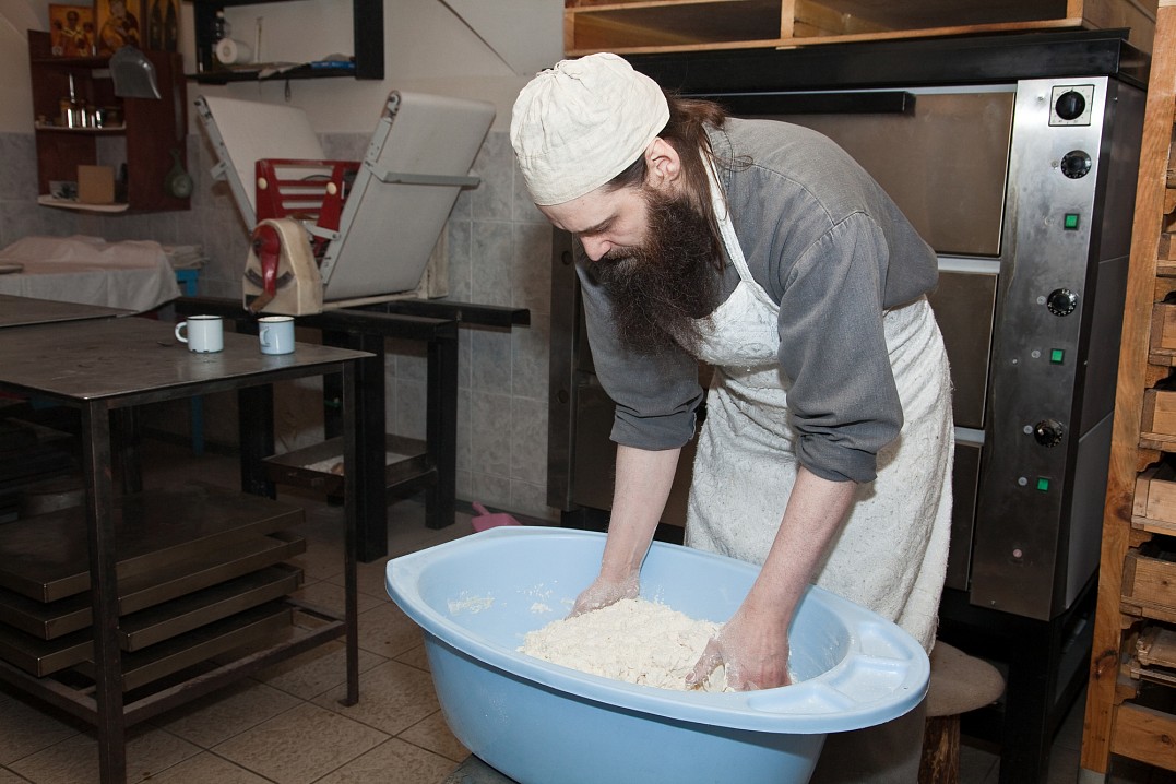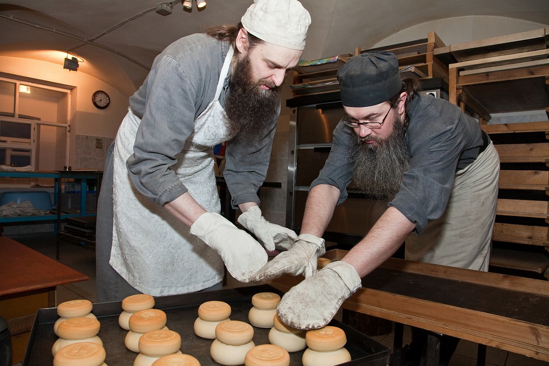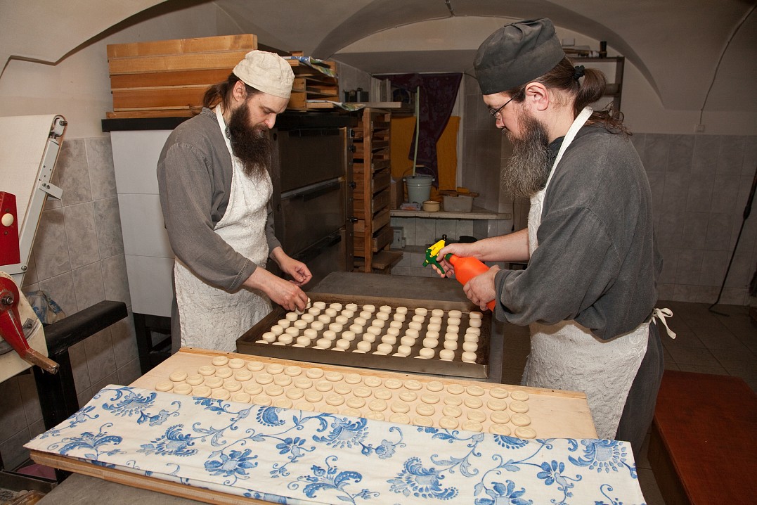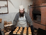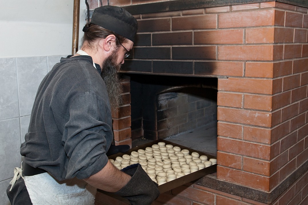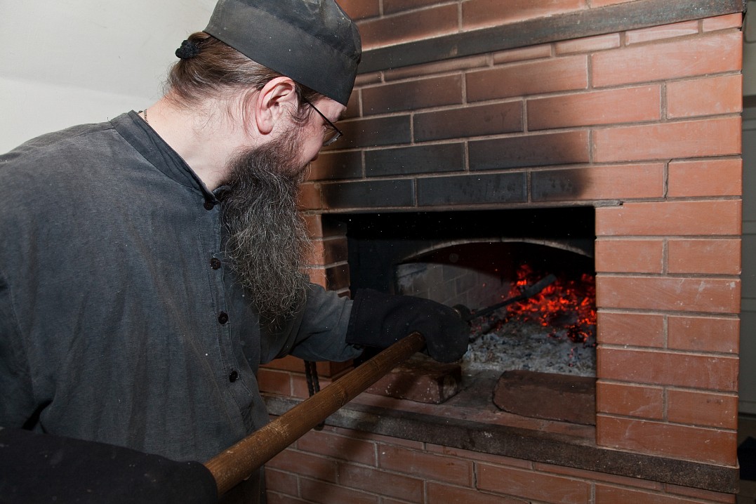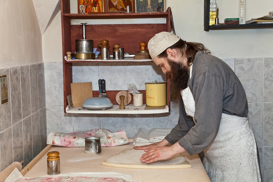 На послушании в Просфорне. На фото: иеродиакон Дамиан, послушник Никон (монах Никандр). Март 2009 года.