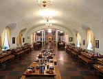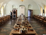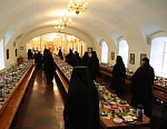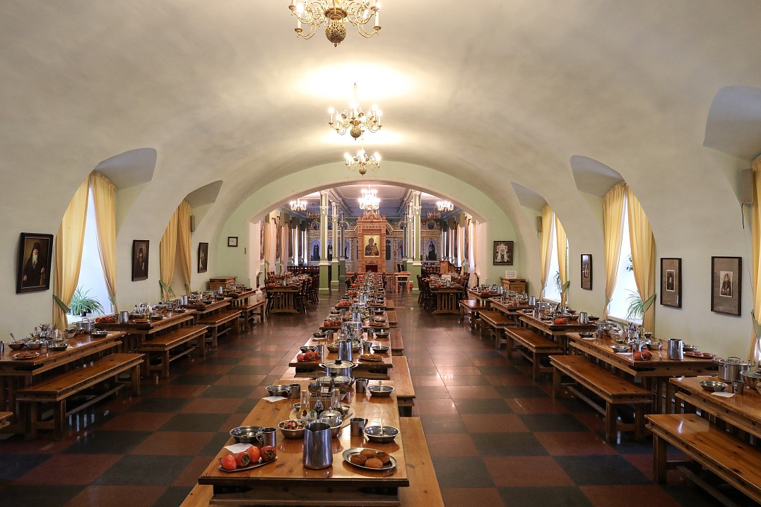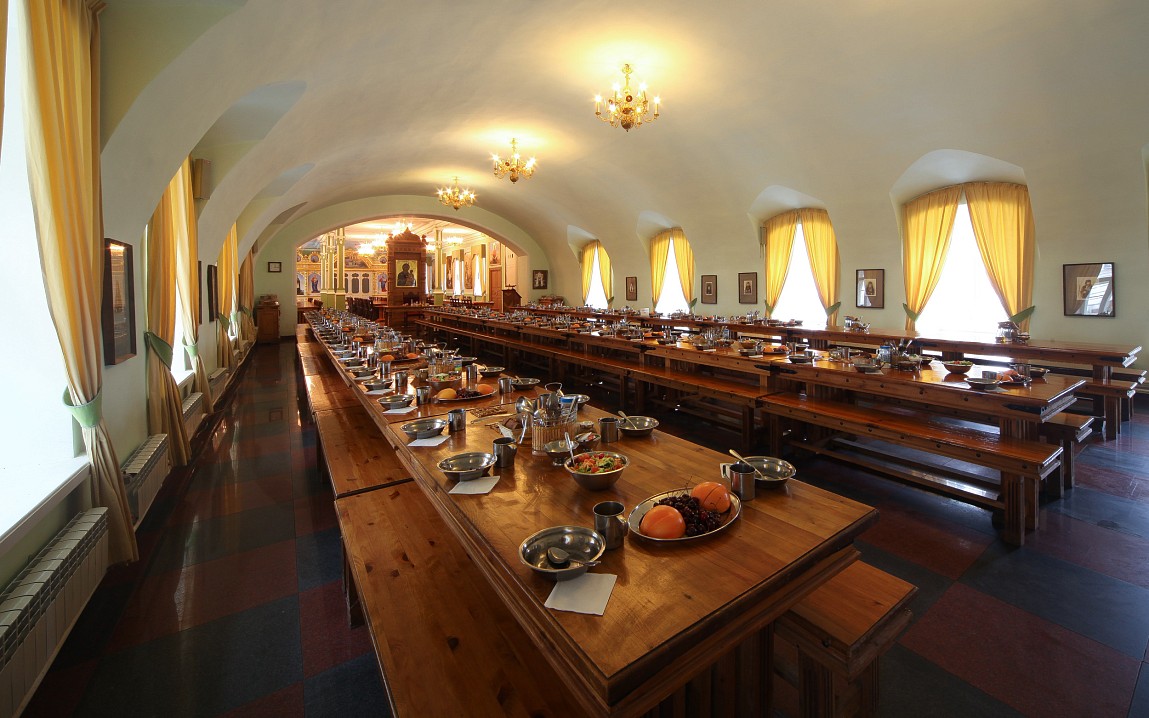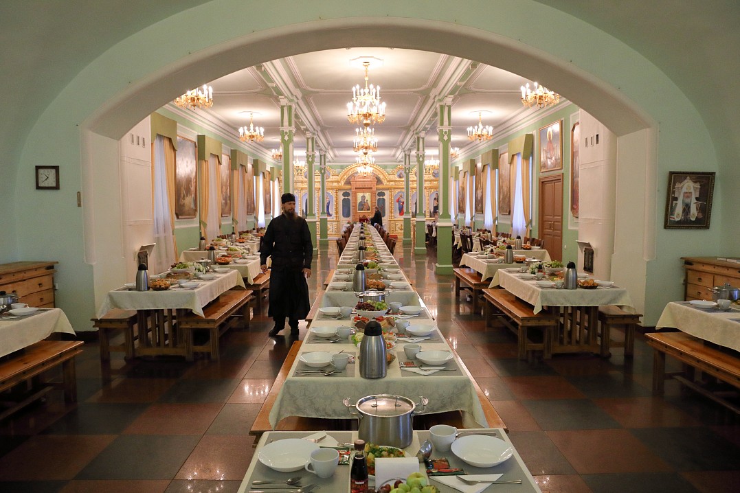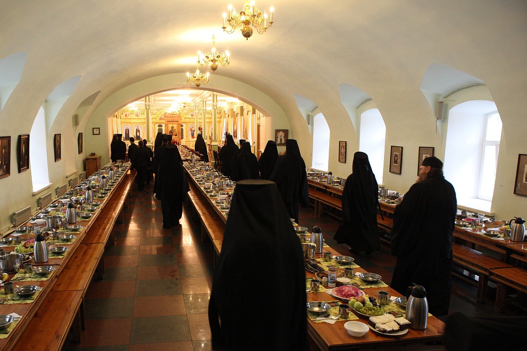 — Наш устав знает только две трапезы – обед и ужин. Имеются соответствующие чины благословения этих трапез и благодарения после них. Во время трапезы читаются жития и поучения святых отцов. Трапеза длится недолго — минут 15-20, для опоздавших есть вторая смена. Для братии, несущей тяжелые физические послушания или имеющих слабое здоровье, у нас еще есть завтрак, впрочем, как и для всех желающих. Лет 20 с прихода на Валаам братии завтраков не было, но потом, видимо, решили сделать снисхождение, т.к. многие должны исходить с самого утра “на делание свое даже до вечера” (Пс. 103, 22–23), и ввиду предстоящих трудов необходимо подкрепление телесных сил пищею.