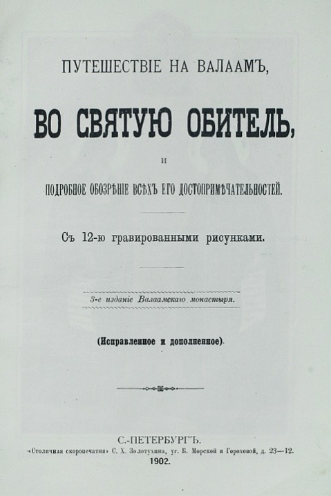 Однако самым распространенным описанием монастыря стала сорокастраничная книжка «Валаамский монастырь. Краткое историческое описание и стихотворение, посвященное сей обители», составленная при участии монаха Петра (Михайлова) и также трижды переизданная (СПб., 1912, 1914 и 1915).