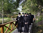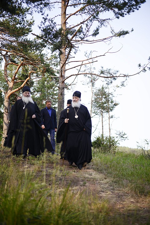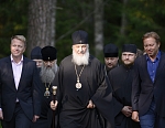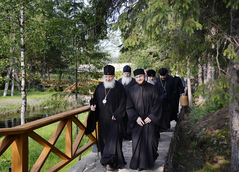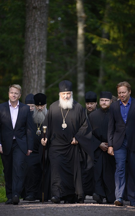 Его Святейшество сопровождали управляющий делами Московской Патриархии митрополит Саранский и Мордовский Варсонофий, руководитель Административного секретариата Московской Патриархии епископ Солнечногорский Сергий, председатель Синодальной комиссии по канонизации святых, наместник Валаамской обители епископ Троицкий Панкратий, скитоначальник иеродиакон Илия (Руднев).