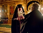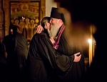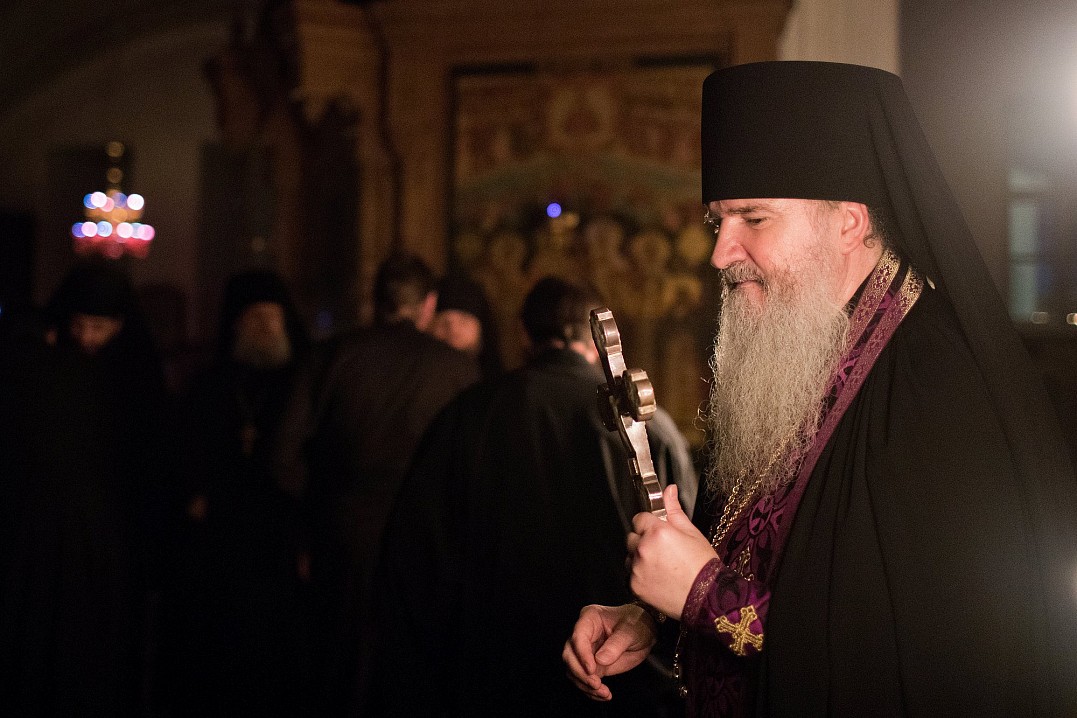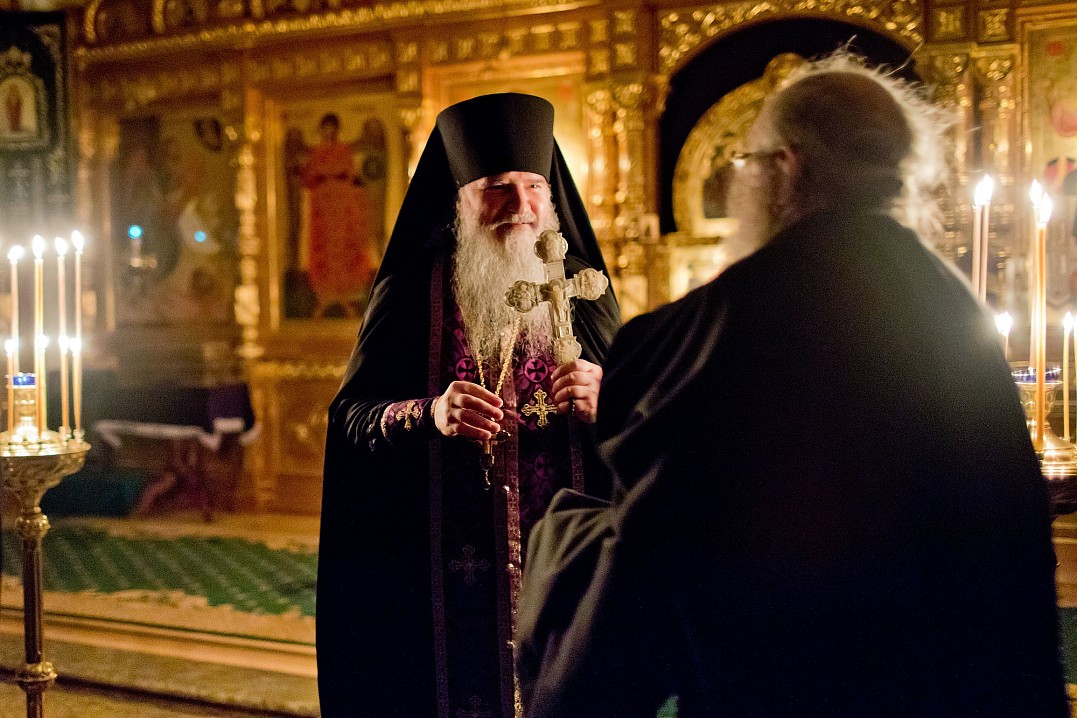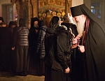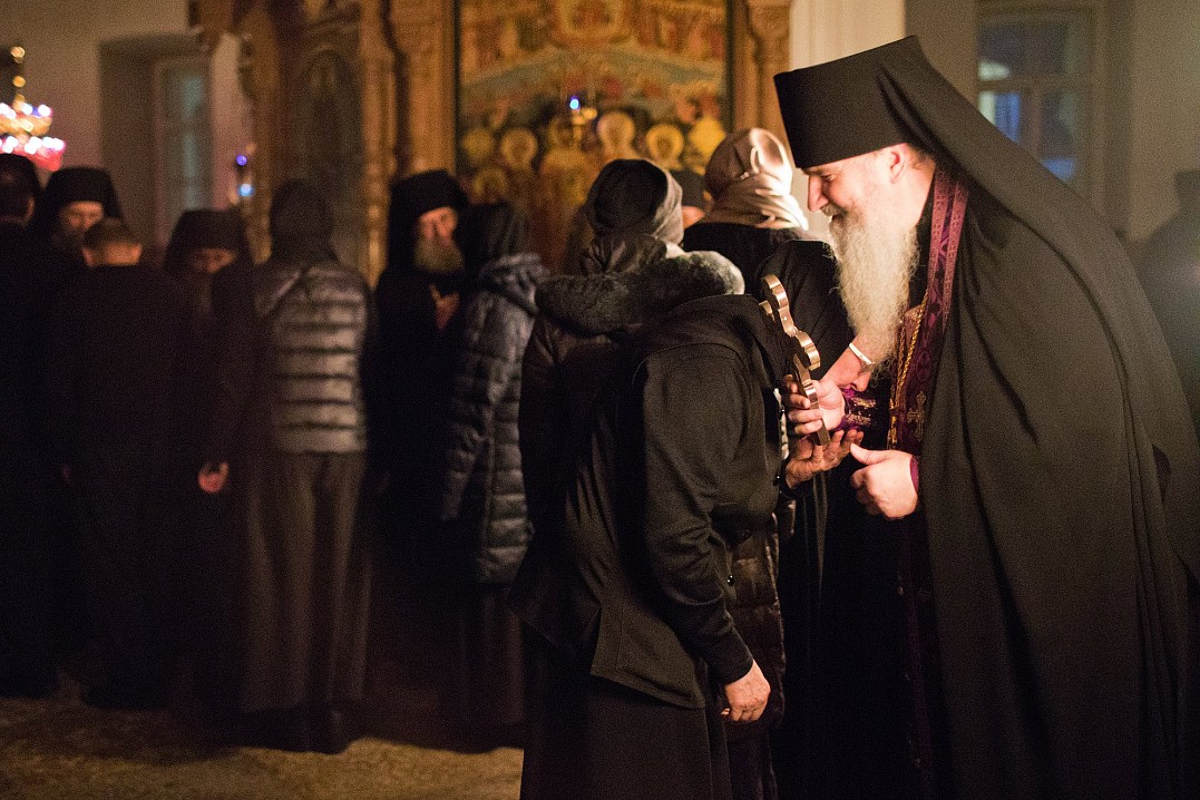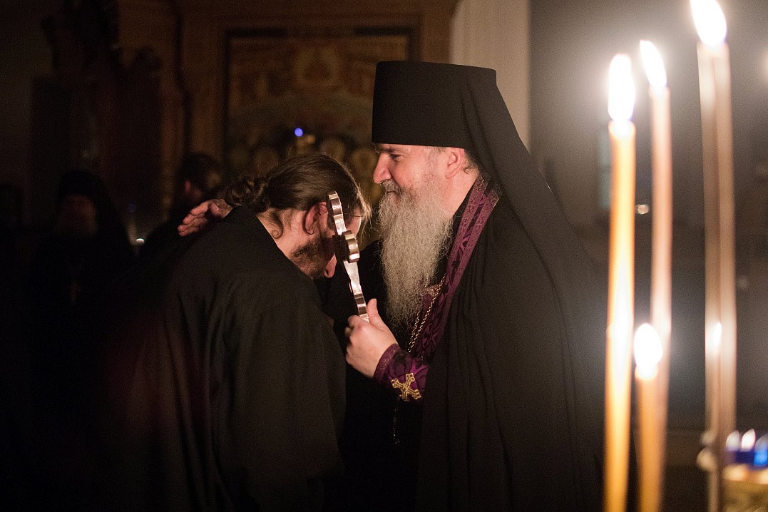 В этом году из-за болезни владыки чин прощения возглавил игумен Мефодий. После малого повечерия отец Мефодий сказал небольшое слово и попросил у всех коленопреклоненно прощения:
