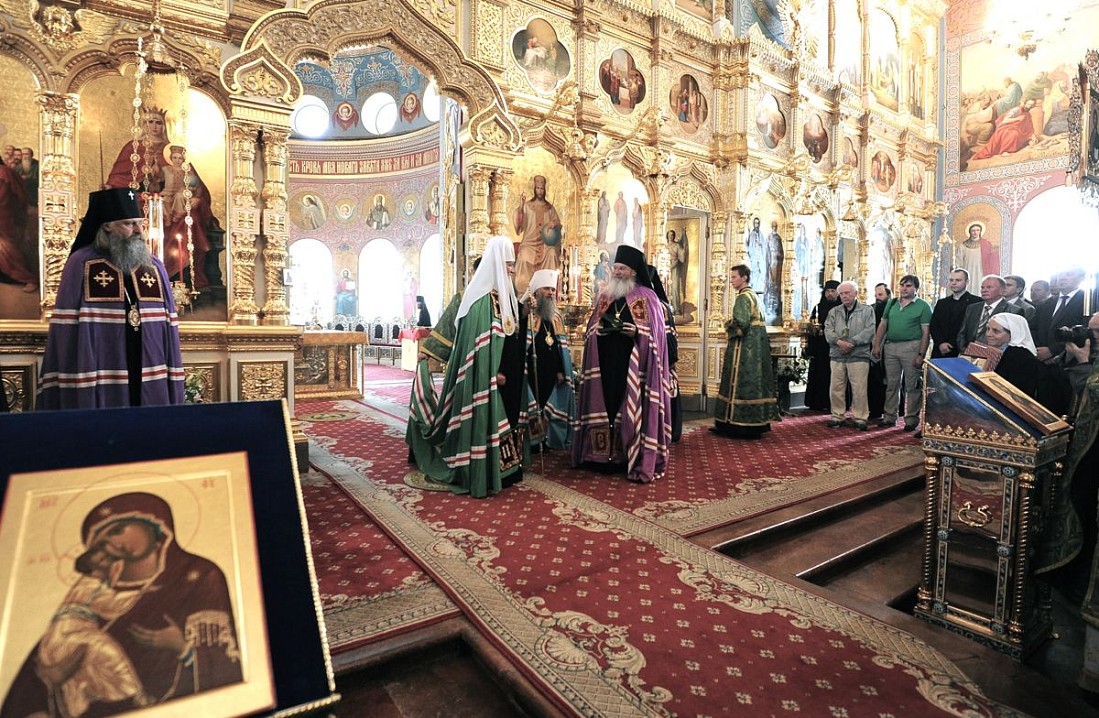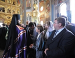 Святейший Владыка вручил епископу Панкратию памятную панагию и передал в дар монастырю список иконы Божией Матери «Вертоград заключенный». Верующим были розданы иконки преподобных Сергия и Германа с Патриаршим благословением.