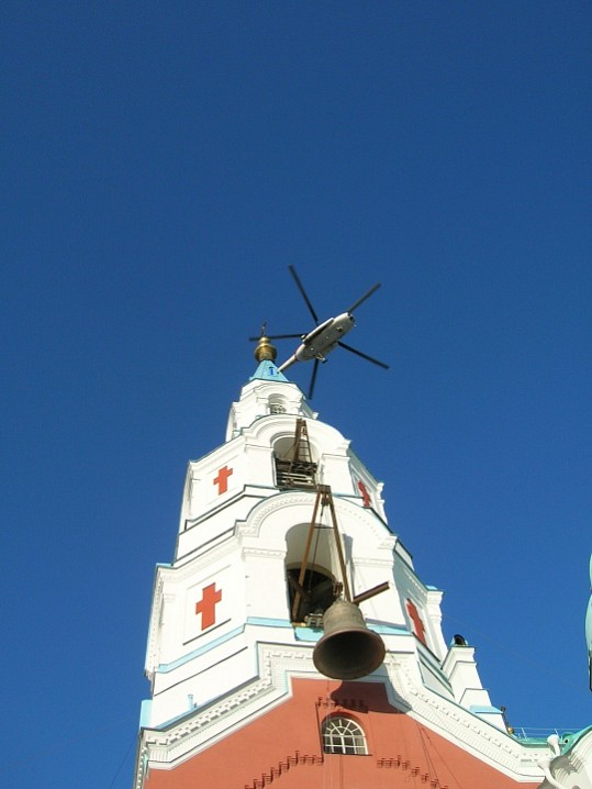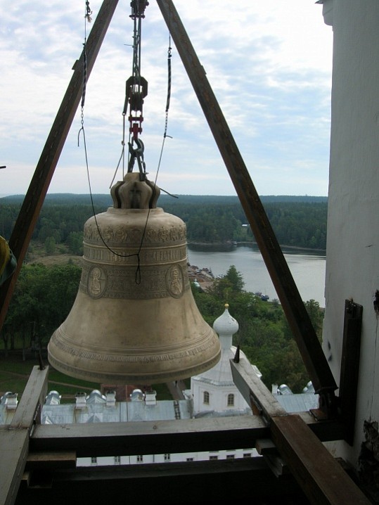 Для поднятия колокола вызывали специальную технику из Санкт-Петербурга – было три месяца подготовительных работ по созданию конструкции, позволяющей поднять колокол на сорокаметровую высоту. Специалисты использовали старинный способ подъема с помощью лебедки, системы блоков и рычагов. Однако колокол требовалось не только поднять до уровня нижнего яруса – исторического места расположения главного Валаамского колокола, но и переместить внутрь колокольни. В связи с этим была разработана уникальная схема, позволяющая совершать не только вертикальное, но и горизонтальное передвижение колокола.