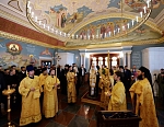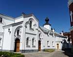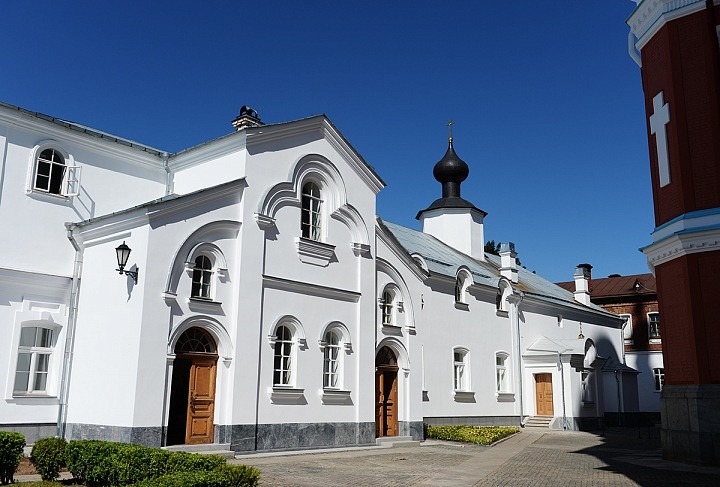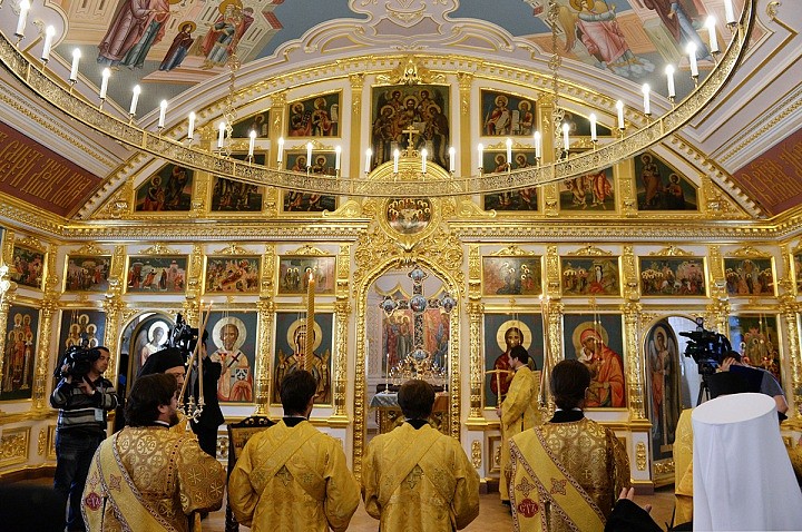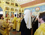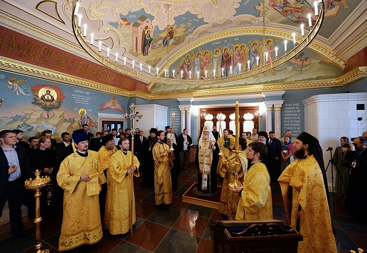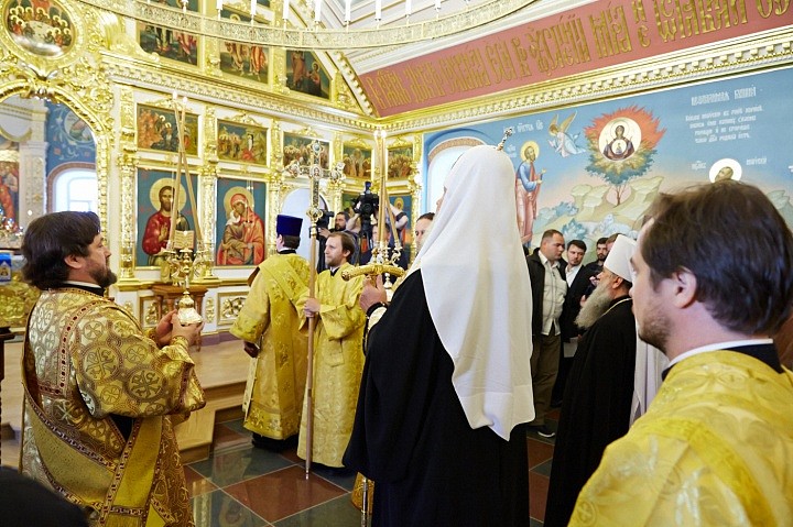 В тот же день Святейший Патриарх совершил чин малого освящения храма Успения Божией Матери Валаамского монастыря, находящегося на территории Внутреннего каре и примыкающего к праздничной трапезной. Отреставрированная Успенская церковь - один из первых храмов, построенных игуменом Назарием в XVIII веке.