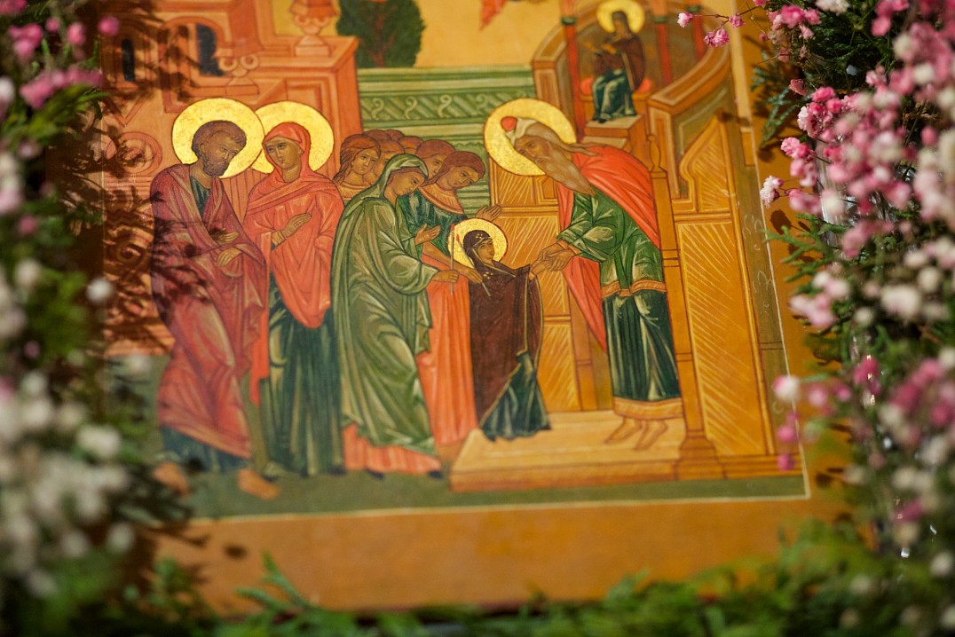 Пресвятая Богородица родилась у состарившихся благочестивых супругов Иоакима и Анны, которые дали обет посвятить дитя Богу. До трех лет дитя было в родительском доме, и, как только ребенок был отнят от груди матери, родители поспешили исполнить обет и посвятить дочь Богу. При ветхозаветном храме жили и выполняли особое служение отроковицы девы, посвященные Богу. Когда трёхлетняя девочка была приведена к ступеням храма, ее встретил тогдашний архиерей и девы, служащие при храме. Чудесным образом без помощи окружающих, но укрепляемая божественной силой, девочка сама пошла вверх по ступеням, а вслед за ней следовали отроковицы девы со свечами. Архиерей ввел девочку во храм Господень, и, по-особому Божию вдохновению понял, что пред ним не простой ребенок, но Святой Сосуд Божественной благодати.