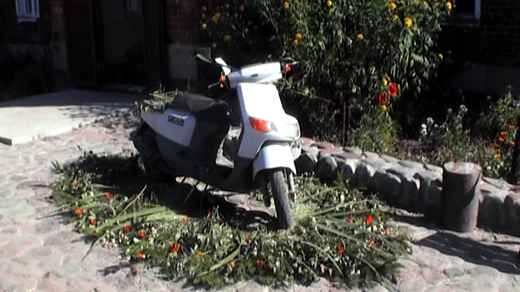 Есть видео короткое, Миша-Марат снял. Мотороллер у подъезда, крыло разбито. Кругом него аккуратно выложена свежескошенная трава, цветы на булыжнике. Окно Георгия на мансарде, форточка открытая. Потом панорама круговая, рваная, нервная, неровная, против всяких правил. Когда смотришь, почти сразу появляется ощущение нелепости какой-то, сначала непонятно почему.