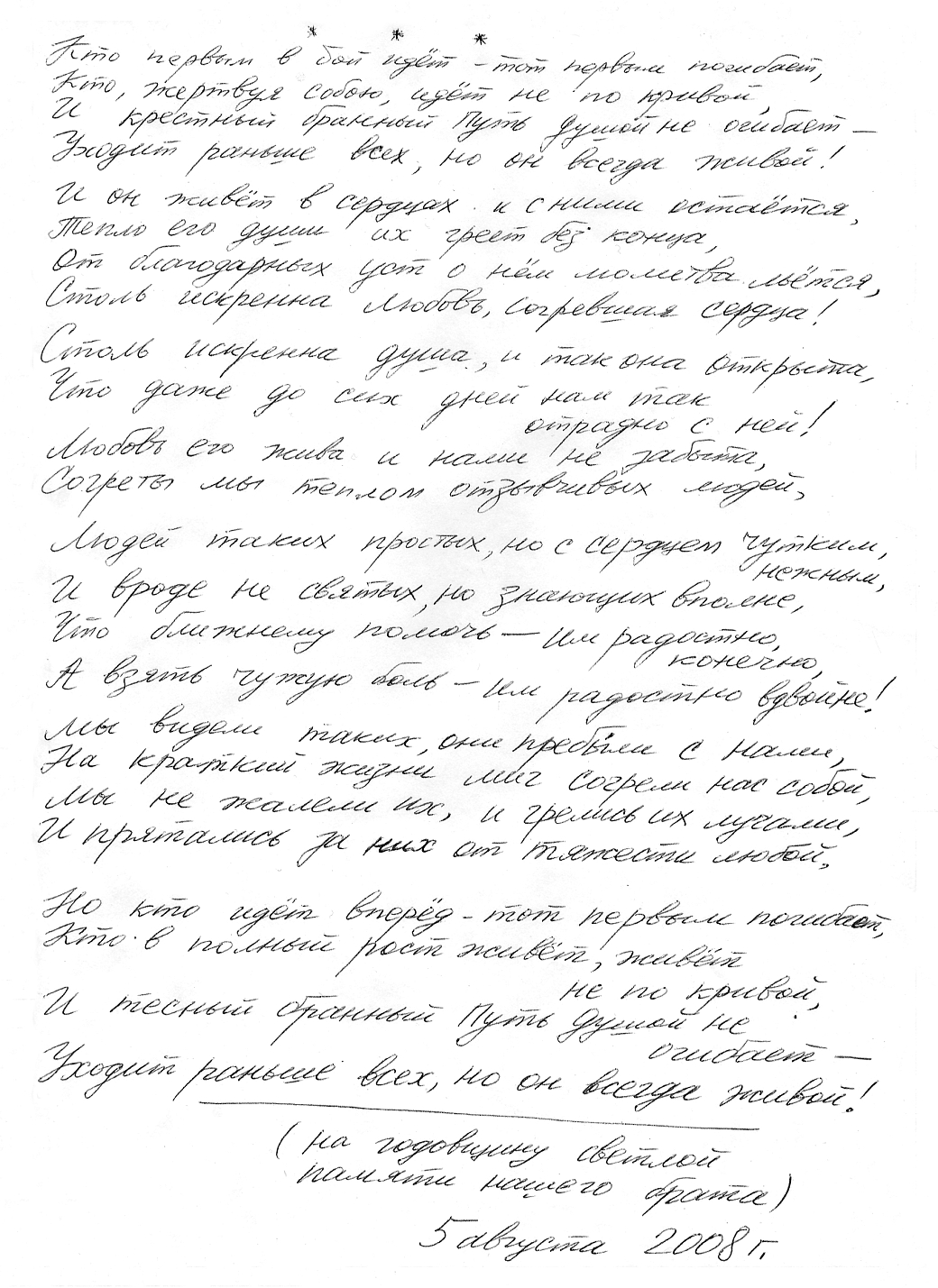 Потом пошёл на ферму. Место аварии по цветам узнал. На сосне рядом приколот листок с чьим-то рисунком и стихами, колышется от ветра и машин проходящих. Стихотворение «Путь» называется, на рисунке монашеский силуэт на фоне синего неба.