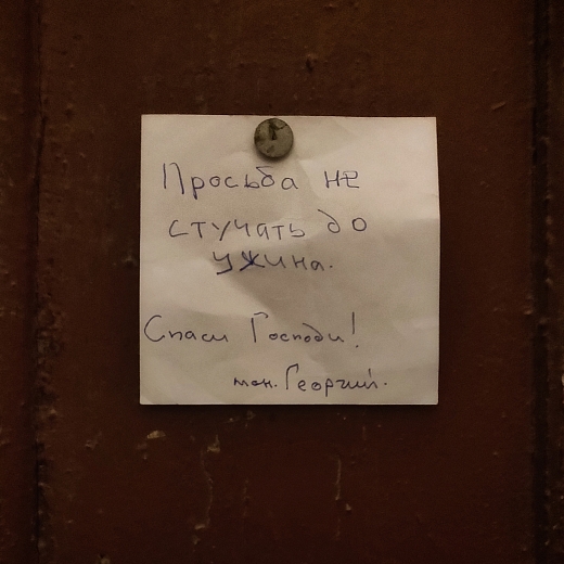 Ещё оставались два-три квадратных листочка, которые он на дверь вешал, когда необходимо было отдохнуть всё-таки: «Просьба не беспокоить. Спаси, Господи!» Не сохранились.