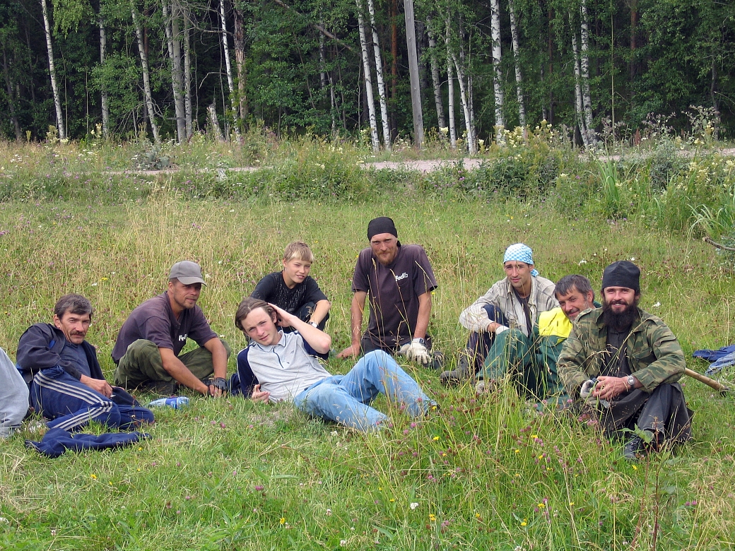 Что им там говорил отец Георгий, я так узнать и не смог, а мне он «секрет фирмы» не открывал. И упрекнуть его в том, что он переманивает трудников, я тоже не мог, — ведь на тот момент этот паломник был ещё свободным человеком, не поступившим в монастырь. «Земля даде плод свой» (Пс. 66:7). Трудники Евгений и Сергий с отцом Георгием. Июль 2006 года