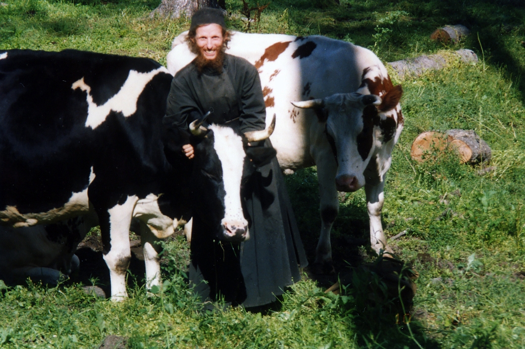 Осенью мы с отцом Вадимом ждали навоз на скитский огород. И навоз с фермы привёз Георгий. Впервые увидел его тогда за рулём на тракторе (ещё «Владимирце»). В полинявшем пастушеском плаще, опоясанный офицерским ремнём, он был спокоен, ловок и гармоничен. Чувствовалось, что на своём месте.