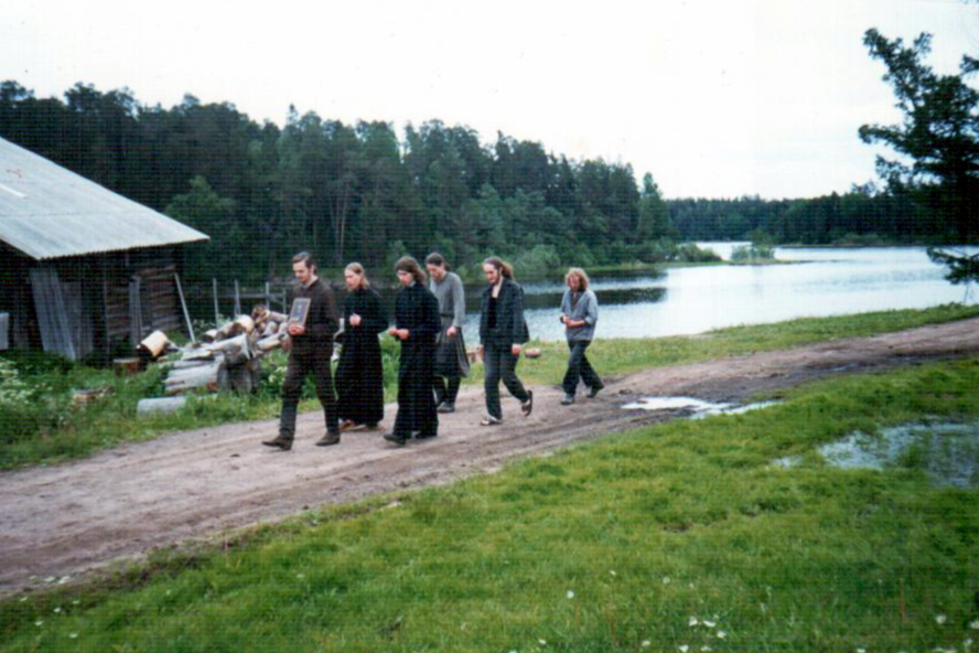 Лето 1998 года. Ежедневный крестный ход вокруг фермы после вечернего правила: Вячеслав (иером. Вениамин), п. Александр (м. Азария), п. Виталий Шумский, п. Сергий (схм. Сергий), Георгий, Алексей (м. Авраам)