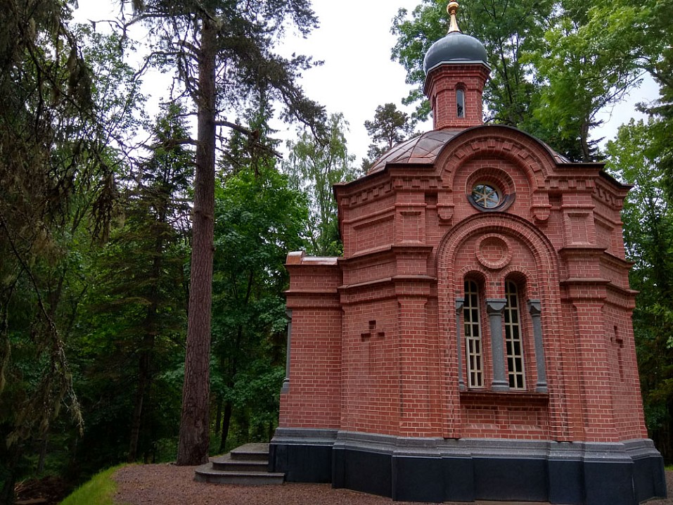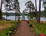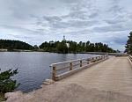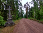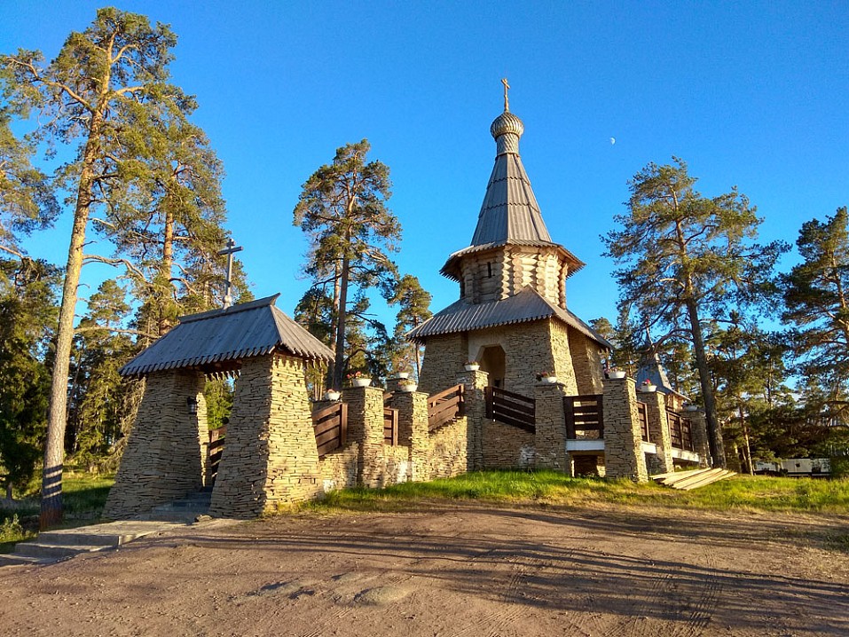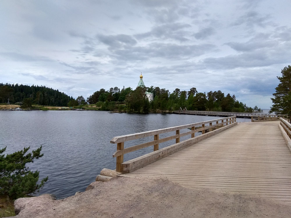 Выйдя из центральной усадьбы, устремляюсь в Никольский скит. Идти всего 1.8 км. Иду мимо братского кладбища, это особое место. Считаю, что даже только ради него стоит сюда приехать. Об этом немного позже. Далее концертная площадка у певческого павильона, какие-то новостройки, живописная дорога вдоль водоёмов, совсем новая часовня во имя Всех валаамских святых, выполненная в оригинальном архитектурном стиле из каменной пластушки.