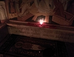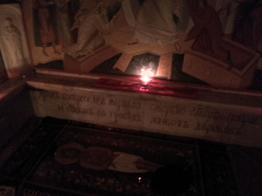 В нижнем храме все сделано наподобие храма в Иерусалиме. Есть камень миропомазания, а за ним, в глубине, Кувуклия с Гробом Господним. В него вмонтирована часть настоящего иерусалимского Гроба.