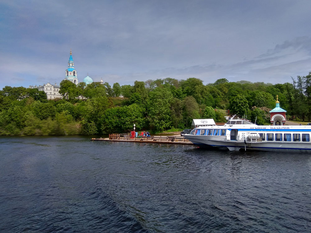 Вот, наконец, подплываем к острову, где нас в первую очередь приветствует храм святителя Николая — архитектурный шедевр Горностаева, визитная карточка острова. Он открывает фотосессию вдоль живописных берегов монастырской бухты. Абсолютно все пассажиры нашего теплохода, включая меня, принимаются жадно фотографировать.