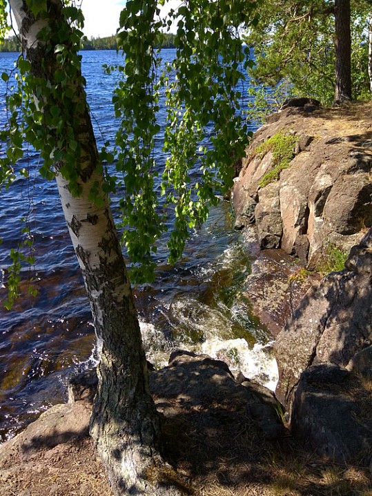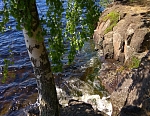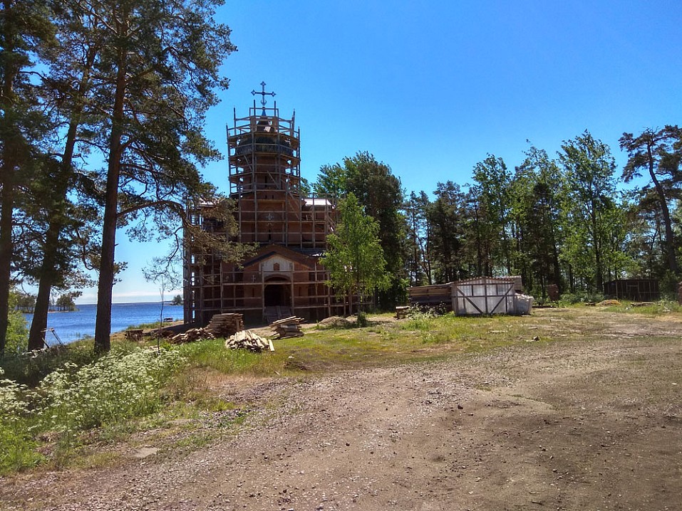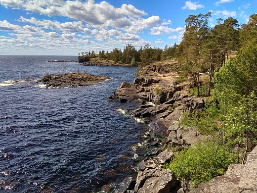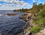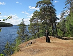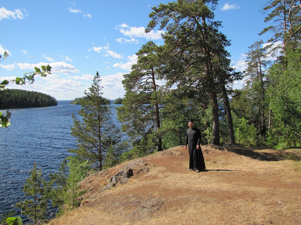 На обед вернулся на свой скит. А после послушник Михаил любезно подвозит меня на микроавтобусе к скиту Воскресения Христова, где живут монастырские экскурсоводы. Это 8 км отсюда. По пути разговариваем на духовные темы. Заезжаем на скалистый берег близ метеостанции с очередными чудесными видами на Ладогу.