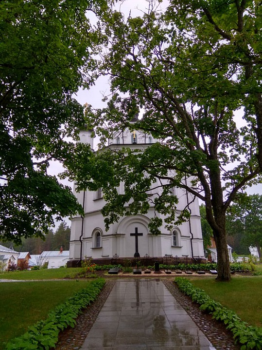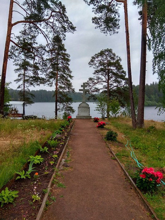 Программа насыщенная, расслабляться некогда, поэтому сразу бежать. Нужно посетить за остаток дня максимальное количество мест. К большому моему огорчению начался дождь. Но это не препятствие для дьякона, влюблённого в Валаам. Достаю зонтик и не закрываю его до конца похода. Составляю маршрут: зайти на братское кладбище — поклониться Божьим угодникам; ещё раз зайти в центральный храм к прп. Сергию, Герману и Антипе. Потом — по скитам.
