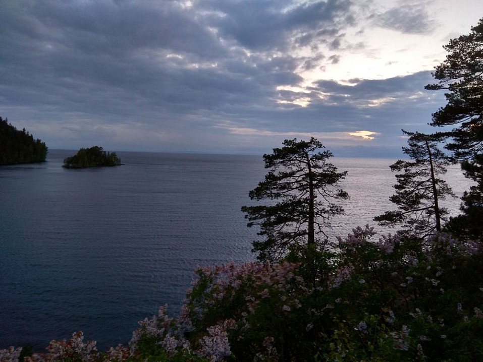 Захожу на отдельно стоящую могилку к пустыннику Николаю и возвращаюсь на Никольский скит, где меня ждут остатки царского ужина — овсяная каша с изюмом. Пройдя в общей сложности 16 км за остаток дня, я нагулял хороший аппетит и гудящие ноги. Однако еще остаются силы спуститься к воде и лишний раз полюбоваться красотой валаамской природы в лучах заходящего в Ладогу солнца. Дождь закончился. Время позднее — начало двенадцатого ночи. Где-то с другой стороны бухты, на островке с часовней богатого внешнего вида, кричат павлины. Шумит Ладога. Страшусь, что за эти неполные три дня, я не успею досыта налюбоваться красотой Валаама.