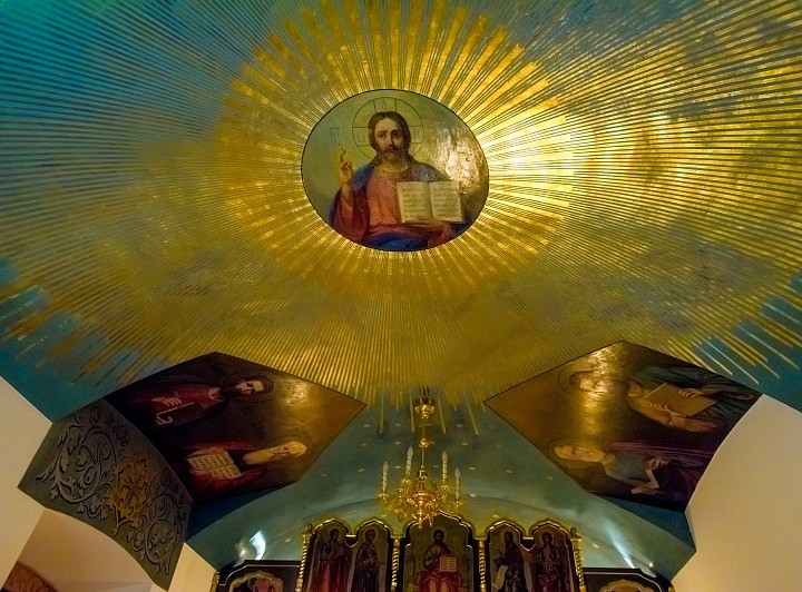 Изображение Спасителя, которое находится в центре, было частично утрачено. Его пришлось восстанавливать по частям, и там видно, что и где писали заново. Потому что еще несколько лет назад на этом месте люстра висела. Мы иногда уже забываем, что в келейном корпусе в советское время размещалось психоневрологическое отделение дома интерната. В домовом храме тогда жили люди.