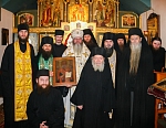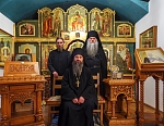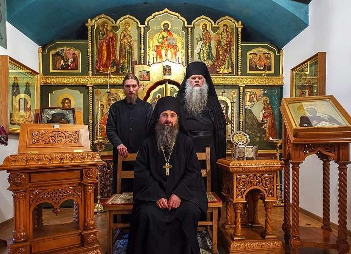 Как-то однажды один наш трудник (он потом стал Ионой - митрополитом всей Америки и Канады) нечаянно отыскал на стенах домашней церкви старые фрески в келейном корпусе. Вот, буквально, ковырнул случайно - и нашёл благословляющую десницу Святителя Алексия, Митрополита Московского и Всея России чудотворца (+1378 г.). А позже уже начали искать по-настоящему. Расчистили вот эти сводики (показывает) - там, в принципе, все росписи сохранились в контуре, что смогли, то восстановили.