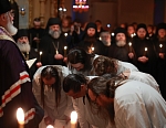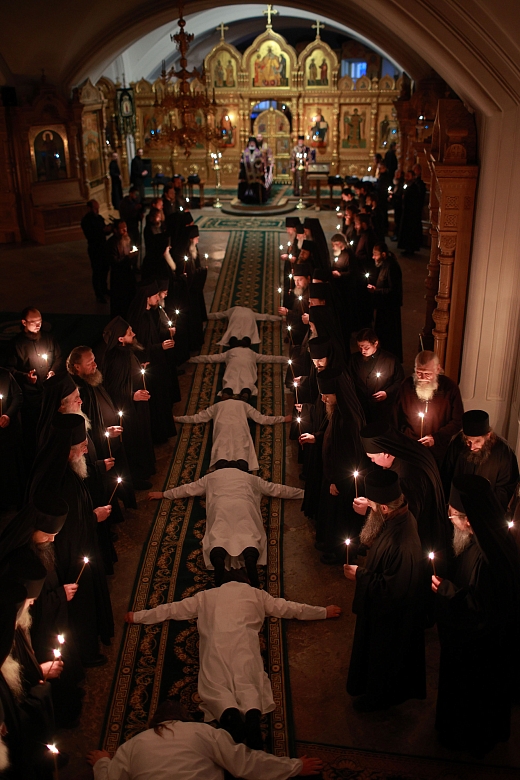 распростёртыми крестообразно руками до тех пор, пока Игумен не дает им знак