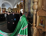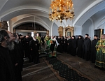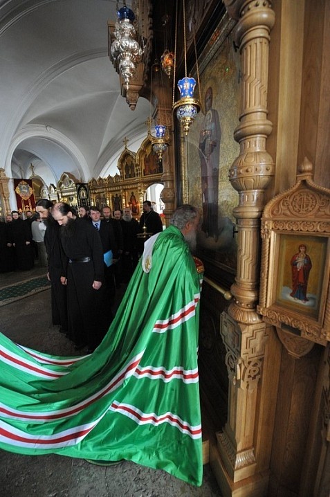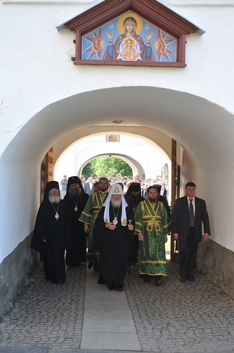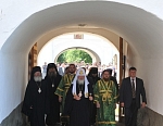 У врат скита Предстоятеля Русской Православной Церкви встречали настоятель схиигумен Серафим (Покровский) с братией.