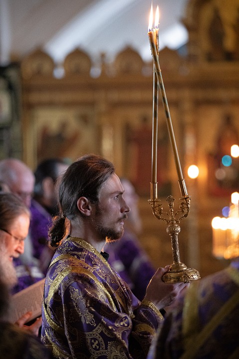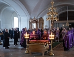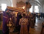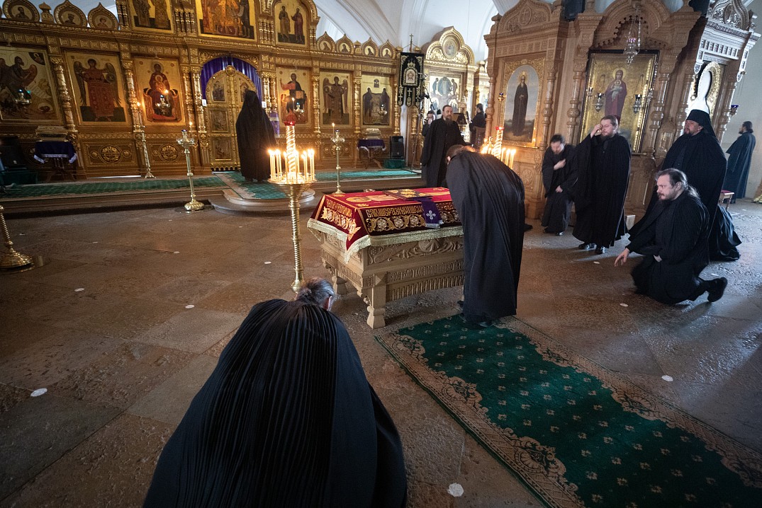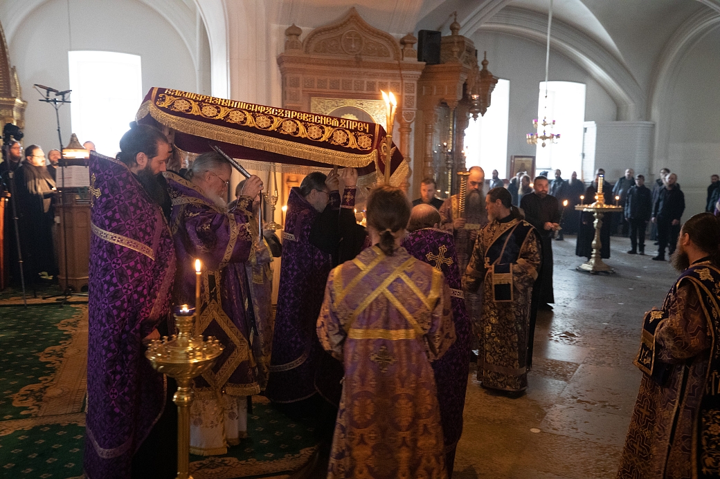 Во время пения стихиры «Тебе одеющагося светом, яко ризою» владыка совершает каждение лежащей на престоле плащаницы с изображением умершего Спасителя, а после этого – вынос плащаницы и положение ее на середину храма. При соборном служении архимандрит Илия и три иеромонаха Савва, Игнатий, Наум поднимают плащаницу на специально приготовленных шестах, а Игумен Панкратий с Евангелием в руках становится под плащаницу. Процессия выходит из алтаря северными дверьми, подходит к царским вратам, где владыка произносит «Премудрость, прости». Затем процессия движется к середине храма, где плащаница полагается на специально приготовленное возвышение. Совершается каждение плащаницы с троекратным обхождением вокруг престола. В это время поются тропари, первый из которых «Благообразный Иосиф» посвящен погребению Христа, а второй «Мироносицам женам» – Его воскресению.