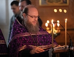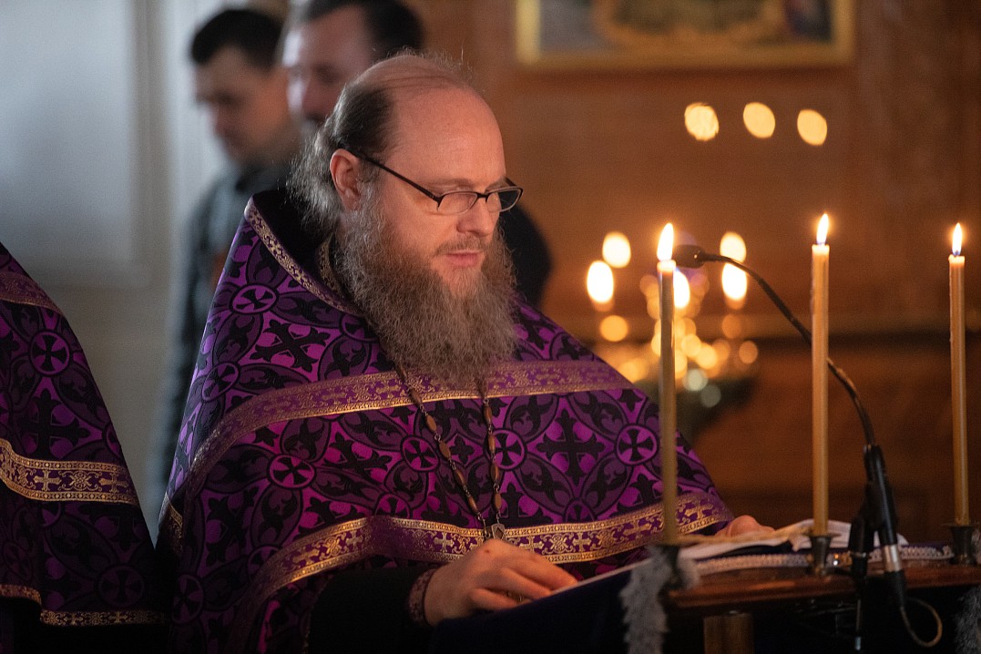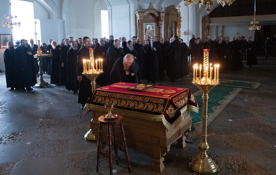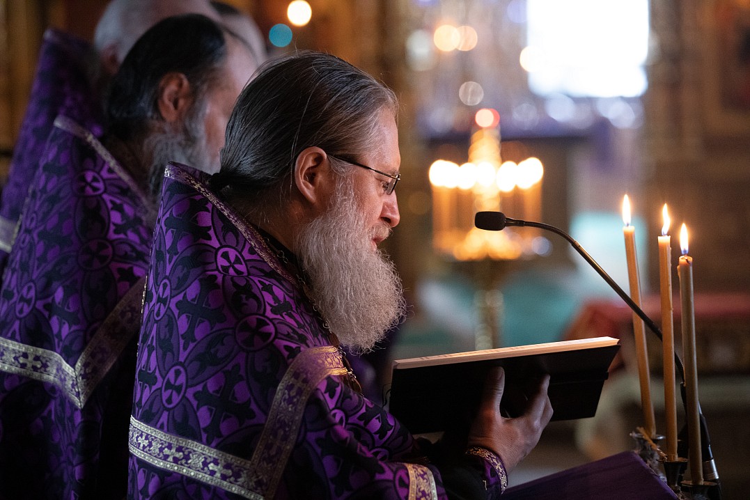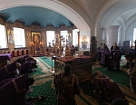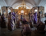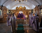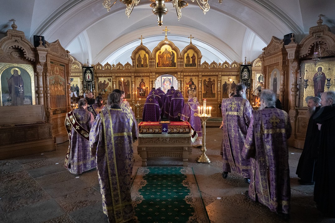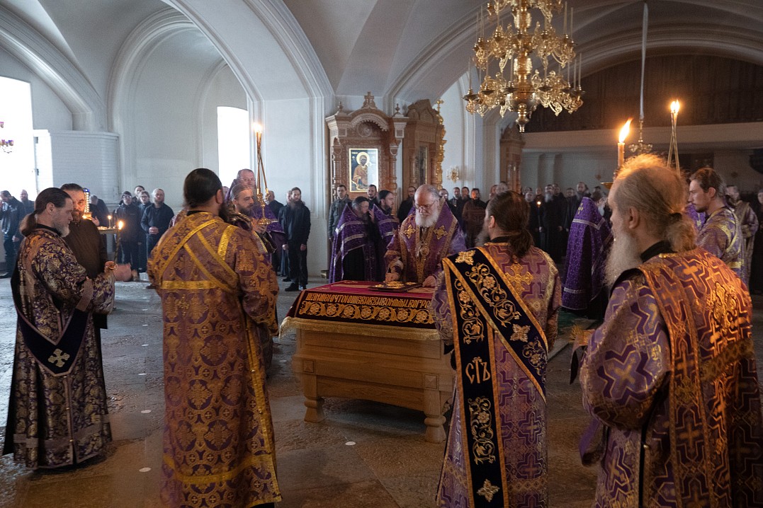 17 апреля 2020 года в Великий Пяток – день, посвященный воспоминанию Святых спасительных Страстей Господа нашего Иисуса Христа, – Игумен Валаамского монастыря епископ Троицкий Панкратий совершил вечерню с выносом Плащаницы Спасителя в храме преподобных Сергия и Германа Валаамских чудотворцев.