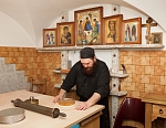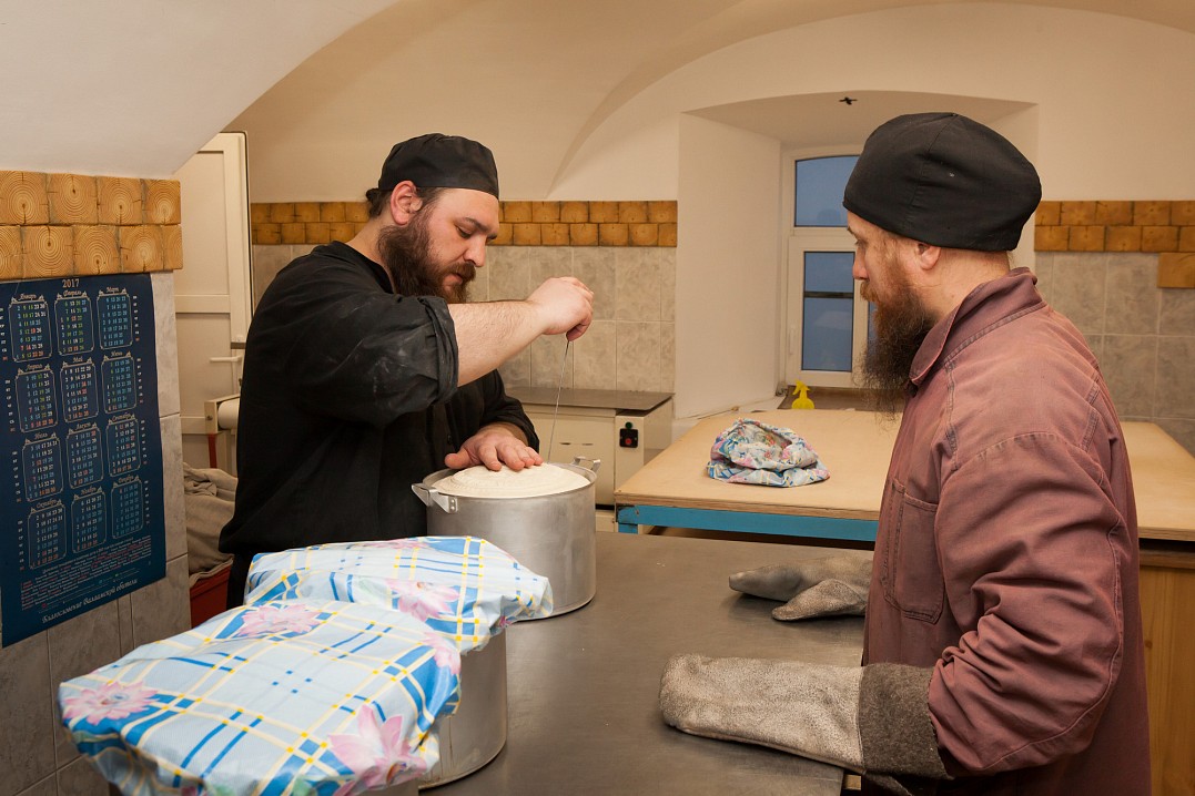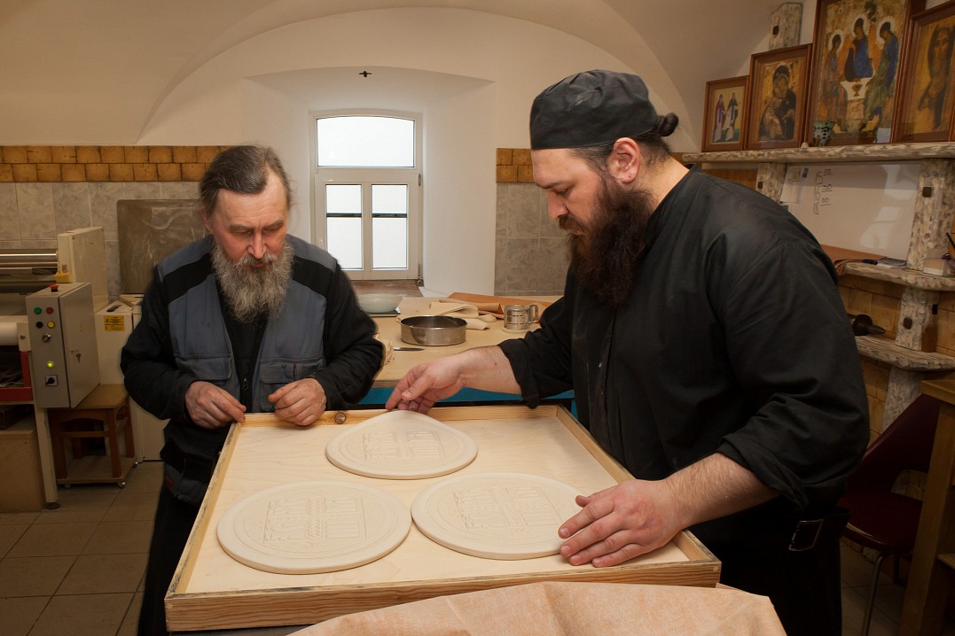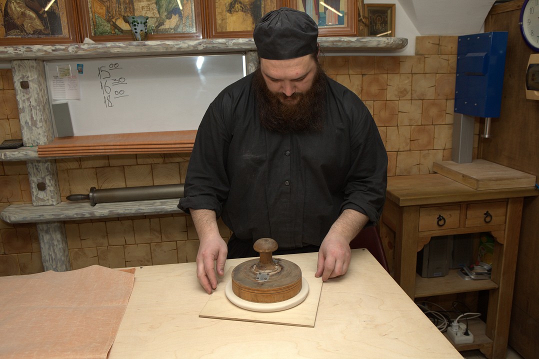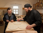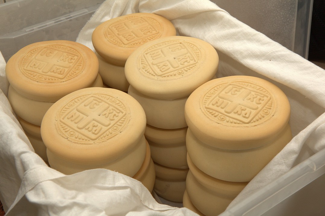 В просфорне монастыря приготовили артосы – особые большие просфоры, которые освятят на Пасху и отправят во все храмы обители. Для каждого престола печется отдельный артос: в Спасо-Преображенский собор нужно три больших артоса, на Центральную усадьбу монастыря – порядка десяти, а всего их требуется более полусотни.