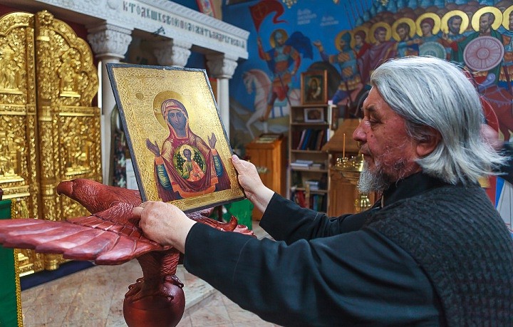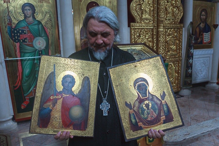 С напутствием передать их на остров Валаам, иконы Архангела Михаила и Пресвятой Богородицы «Знамение» были получены монахом Иосифом как благословение при монашеском постриге в 1971 году в Псково-Печерском монастыре.