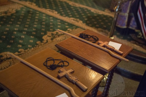 И в этот момент впервые на святой Валаамской земле звучат новые монашеские имена. Инок Виктор стал монахом Виссарионом, инок Фока получил имя святого Папилы, инок Никон получил имя в честь святого Никандра, рясофорный послушник Максим стал монахом Мануилом, послушник Никита стал монахом с именем Феофил, рясофорный послушник Николай стал монахом Никитой.
