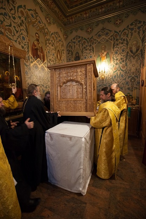 Также, в своем слове владыка поблагодарил игумена Иосифа, под чьим руководством происходил процесс ремонтно-восстановительных работ в нижнем храме: «Я благодарю отца Иосифа, благодарю тех людей, которых он привлек к тому, чтобы этот храм полностью приобрел свой первозданный вид. Я желаю, помощи Божьей всем тем, кто помогал трудиться над восстановлением храма, и тем, кто молится здесь, и тем, кто окормляет паству подворья, чтобы каждый из вас честно, добросовестно и с полной отдачей души и сердца, с любовью к Богу, к ближним исполнял свое делание, свое послушание. Да хранит вас Господь и Матерь Божья!». По завершении проповеди молящиеся пропели «Вечную память» приснопамятному Патриарху Алексию II, устроителю подворья схимонаху Иоанну (Собакину) и благотворителям, трудами которых в начале ХХ века было построено здание подворья. В след за этим были пропеты «Многая лета» Святейшему Патриарху Кириллу, епископу Панкратию, клирикам, братии, прихожанам, а также благотворителям подворья, благодаря лептам которых были осуществлены реставрационные работы.
