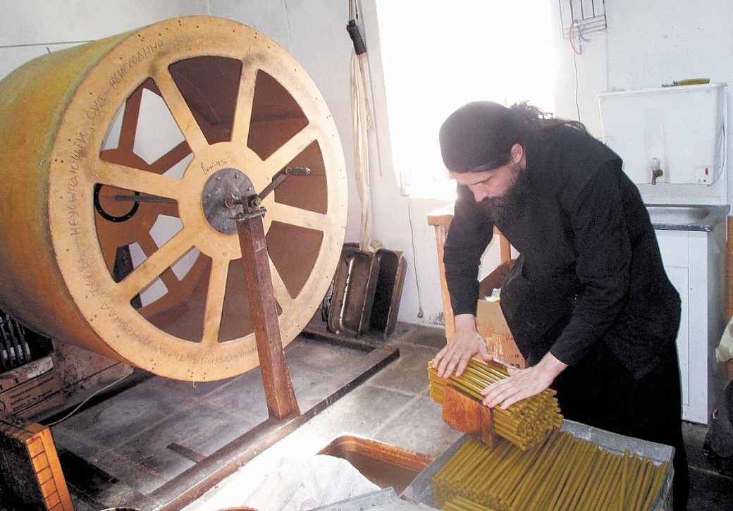Трудятся монахи и на производстве свечей. В обители есть небольшой свечной завод, выпускающий до 40 кг церковных свечей в сутки.