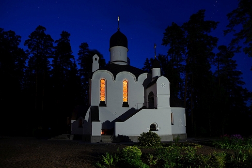 … Один час на скоростном катере от центральной усадьбы, и перед тобой встают угрюмые седые скалы, в которые корнями проросли сосны. Катер заходит в шхерный район: диво дивное. Маленький причал: ступеньки идут вверх. Поднимаюсь: картина – словно из сказов. Полуразвалившийся храм красного кирпича постройки 1903-1904 годов. И то, что осталось от него, свидетельствует: он был очень красив и необычен (архитектор – Николай Прокофьев, участвовавший в постройке Спасо-Преображенского собора, главного храма Валаамской обители). Романтичность пейзажу придают молодые деревца, нашедшие приют на его стенах. Взгляд уходит ввысь. И замирает.