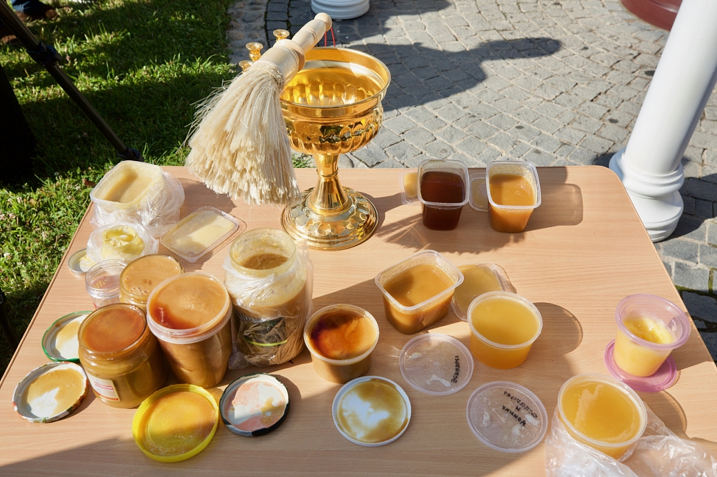 «Необыменный в милости и неизреченный во щедротах, Господи Иисусе Христе, дивен Сый во славе и творяй чудеса. Ты, действом Святаго Духа иногда благословивый Израиля, и его медом насытивый от камене, Сам и ныне призри свыше на создание Твое сие, и благословением Твоим небесным благослови и освяти соты пчел и от них мед, и подаждь ему действенну благодать, паче всех совершенну, да всяк от него вкушающий, приемлющий и ядущий обрящет благополучное здравие, и пищею сею насытится, и исполнится всякаго блага. Яко Ты еси подаваяй всяческая благая, и Тебе славу возсылаем, со Безначальным Твоим Отцем и Пресвятым и Благим и Животворящим Твоим Духом, ныне, и присно, и во веки веков. Аминь», – читалась сегодня молитва ко Господу во время молебного пения, в которой мы просили Его ниспослать благодать во освящение меда, да всякий вкушающий его обрящет здравие.