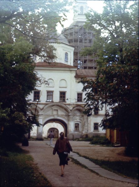 Надвратная церковь первоверховных апостолов Петра и Павла и проход в монастырь. 1990 г. Справа виднеется "красный магазин", бывшая иконно-книжная лавка, а до недавнего времени злачное место, снабжающее дешевым пойлом, папиросами и кое-какими продуктами ме