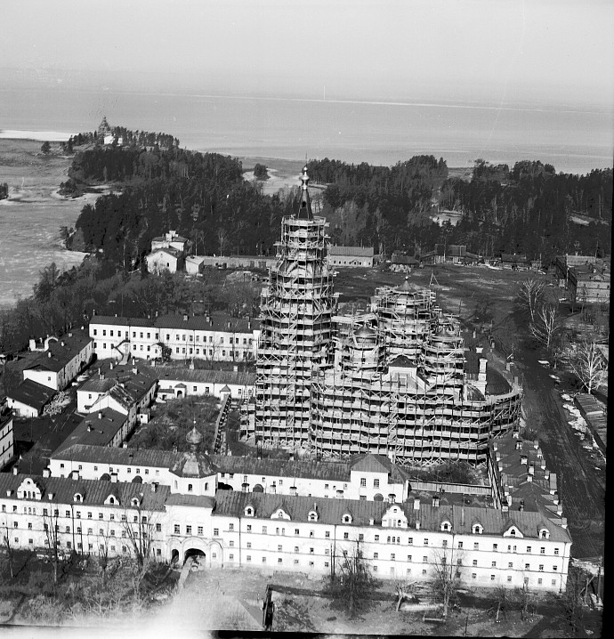 «На Крещение 1993 года был подписан указ о моем назначении, и в начале февраля я из Троице-Сергиевой лавры, где до этого был экономом, уже прибыл на Валаам. Я, конечно, ожидал увидеть достаточно печальную картину, но то, что открылось передо мной, было настоящим ужасом. На тот момент Троице-Сергиева лавра была давно отреставрирована, а здесь все рушилось прямо на глазах. Везде разруха, облупленные стены. Спасо-Преображенский собор был окружен уже сгнившими черными лесами, от которых стены отсыревали и разрушались еще больше. Корпуса тоже были в очень плохом состоянии. Никаких удобств не было: ни канализации, ни водопровода. Все монастырское хозяйство было разорено, поля заболочены и зарастали мелколесьем. Электричество на всем острове отключали на целые часы веерным образом, потому что была одна старая дизельная электростанция.