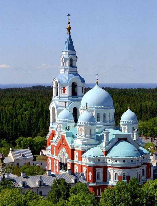 Преображенский собор с его нежно-голубыми главами и остроконечной колокольней хорошо виден всеми прибывающими на остров паломниками и туристами. Построен он был в конце XIX века в псевдовизантийском стиле, став уже третьим храмом на этом намоленном месте.