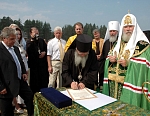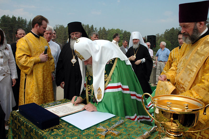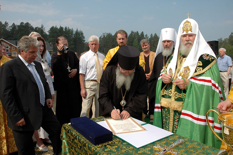 Вторая веха – это 1988 год. У членов Попечительского Совета может возникнуть вопрос: "Почему новый скит, строящийся на Валааме, посвящен святому князю Владимиру – просветителю земли Русской?" Потому, что возможность возобновления монашеской жизни на Валааме реально появилась лишь в 1988 году, – в год Тысячелетия Крещения Руси. Спустя полвека после первого посещения Господь снова вновь судил мне, в бытность митрополитом Санкт-Петербургским и Новгородским, совершить паломничество в прославленную обитель и впервые отслужить панихиду на Игуменском кладбище, где за алтарем кладбищенского храма погребены игумены монастыря. Ленинградское телевидение создало небольшой фильм, где на фоне служения панихиды показывались портреты валаамских игуменов и братии обители.