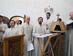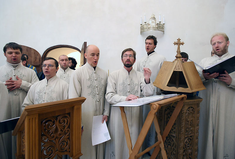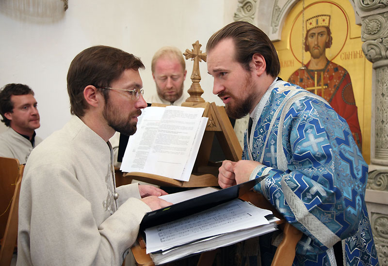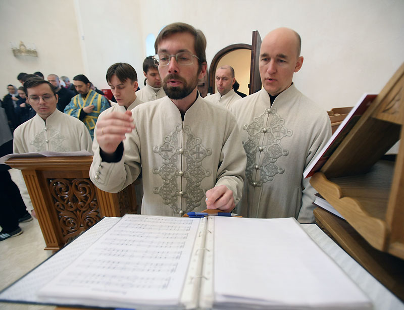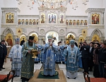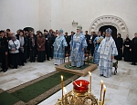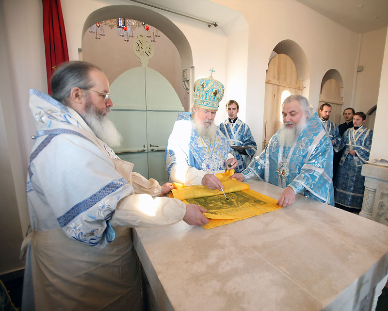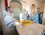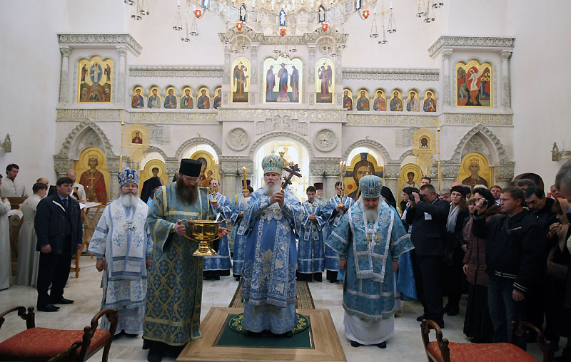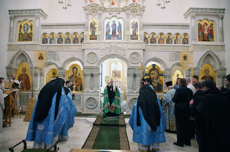 Затем в новоосвященном храме была совершена первая Божественная литургия. Его Святейшеству сослужили архиепископ Истринский Арсений и наместник Валаамского монастыря епископ Троицкий Панкратий.