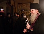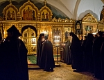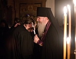 В этом году из-за болезни владыки чин прощения возглавил игумен Мефодий. После малого повечерия отец Мефодий сказал небольшое слово и попросил у всех коленопреклоненно прощения: