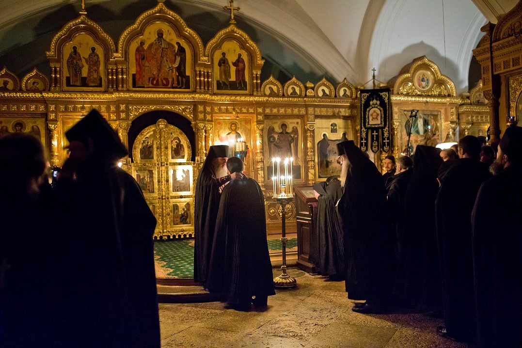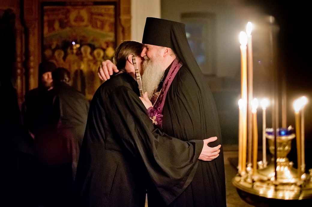 Затем вся братия и присутствующие в храме подходили к игумену Мефодию, делали поклон (поясной или земной) и испрашивали у него прощение, принимая благословение, и просили друг у друга прощение. Весь храм наполнился словами: