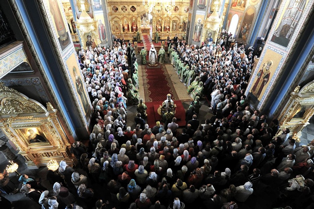 2012 год. Святейший Патриарх Московский и всея Руси Кирилл возглавил служение Божественной литургии в верхнем храме Спасо-Преображенского собора Валаамского монастыря