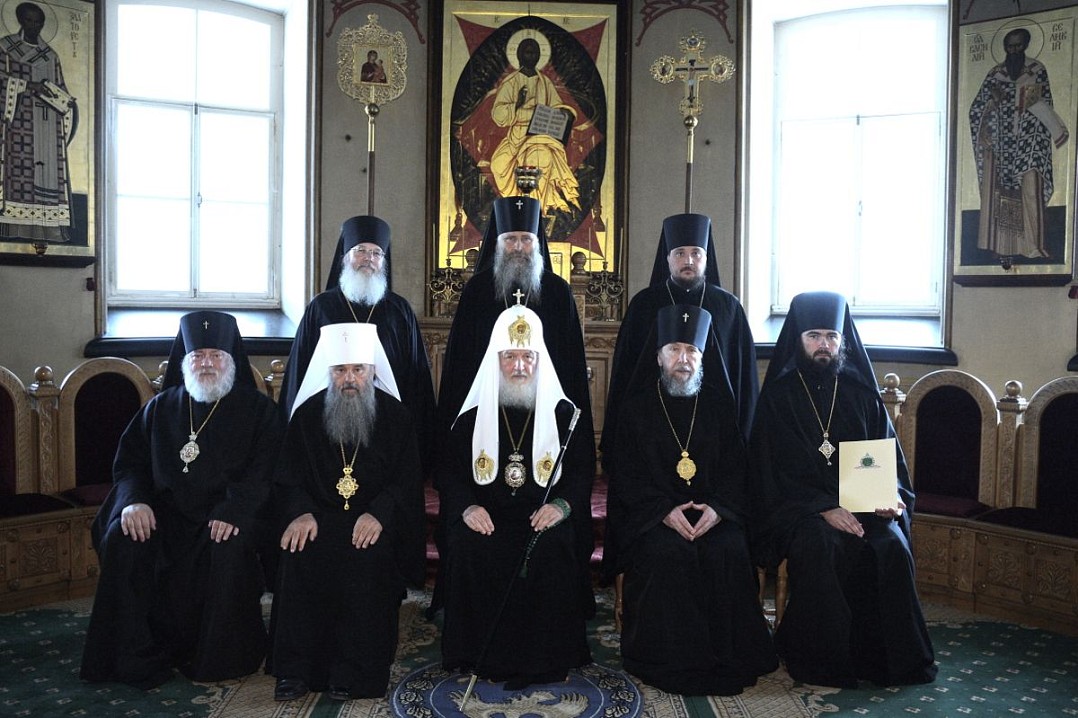 От лица братии Валаамской обители Святейшего Патриарха приветствовал епископ Троицкий Панкратий, который преподнес Его Святейшеству икону преподобных Сергия и Германа Валаамских.